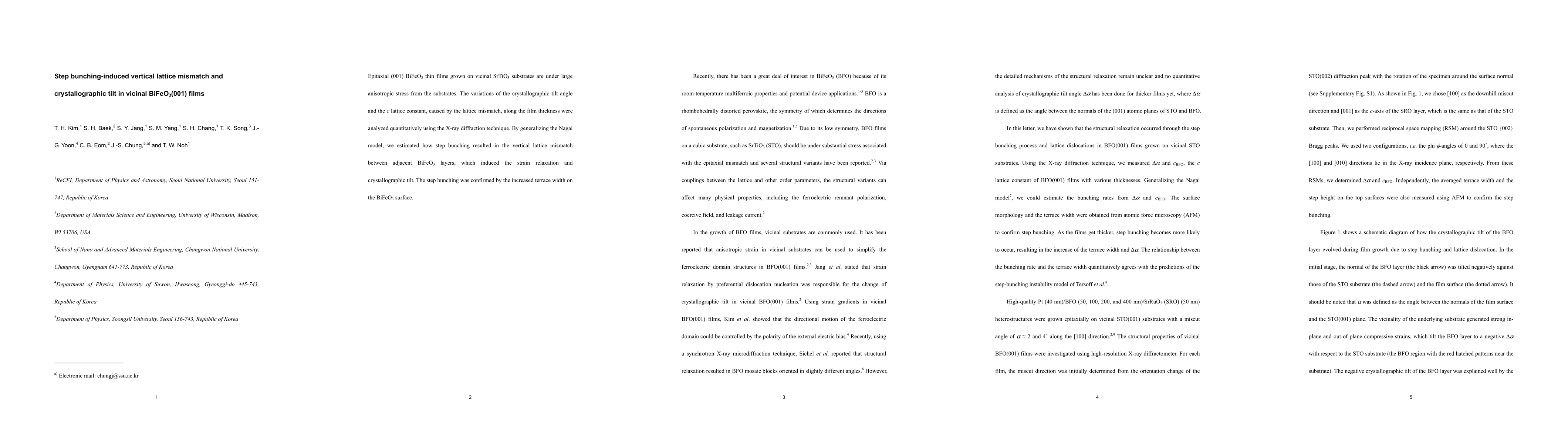 This study investigates the vertical lattice mismatch and crystallographic tilt in epitaxial (001) BiFeO3 films on vicinal SrTiO3 substrates, attributing these variations to step bunching and strain relaxation. The analysis, using X-ray diffraction, reveals how step bunching induces vertical lattice mismatch and tilt, confirmed by increased terrace width on the BiFeO3 surface.