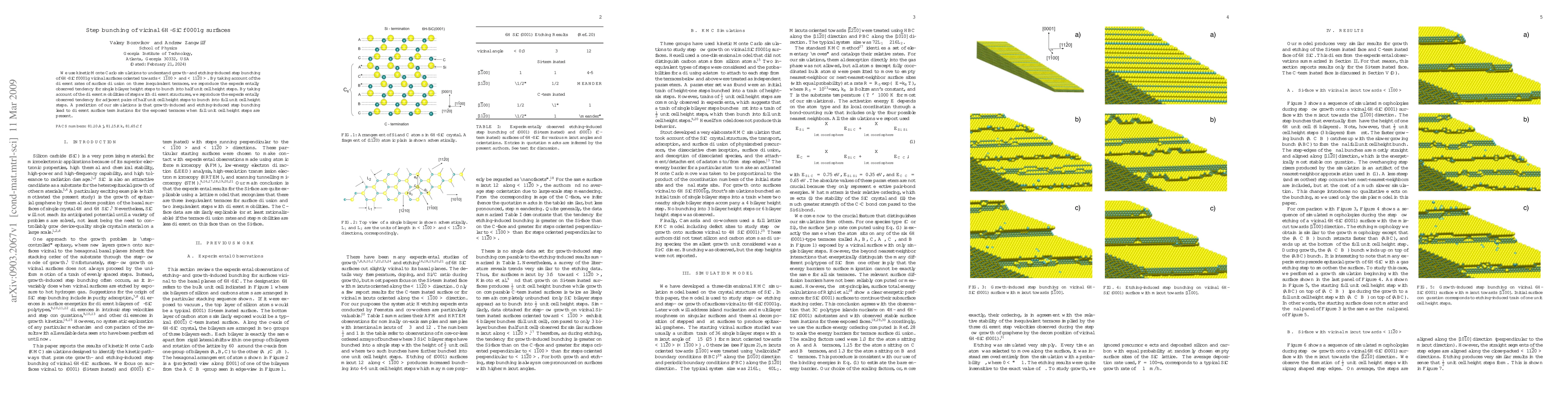 This research uses kinetic Monte Carlo simulations to model step bunching on vicinal 6H-SiC{0001} surfaces, showing that different diffusion rates on terraces lead to the formation of half and full unit cell height steps. The study predicts distinct surface terminations from growth- and etching-induced step bunching.