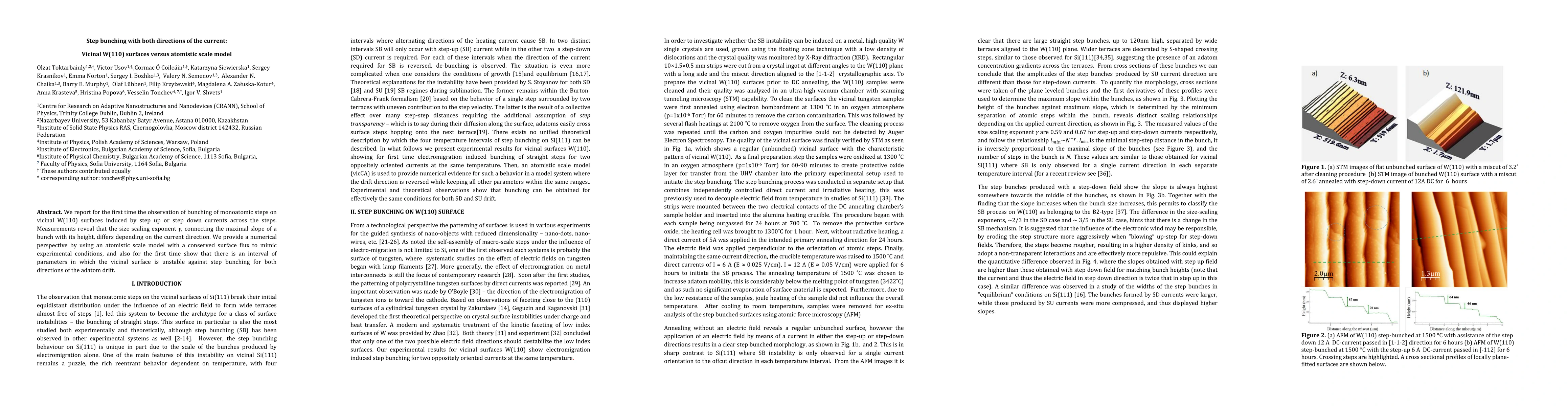 This research observes step bunching on vicinal W(110) surfaces due to current flow in both directions, revealing differing size scaling exponents based on the current direction. An atomistic scale model confirms the presence of an unstable parameter interval for step bunching in both current directions.