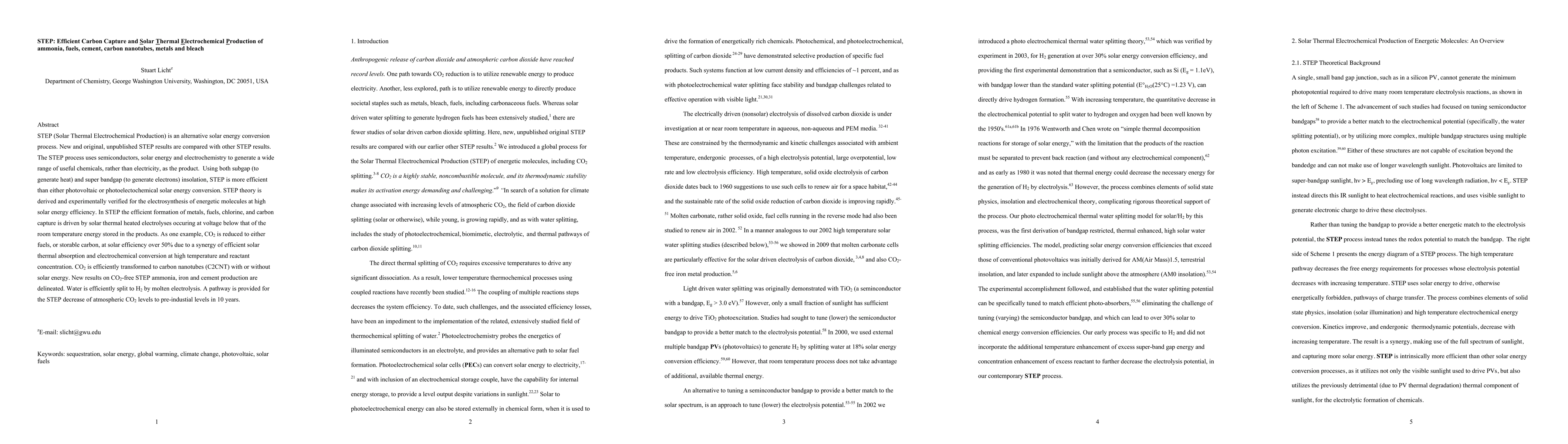 STEP (Solar Thermal Electrochemical Production) is an alternative solar energy conversion process. New and original, unpublished STEP results are compared with other STEP results. The STEP process uses semiconductors, solar energy and electrochemistry to generate a wide range of useful chemicals, rather than electricity, as the product. Using both subgap (to generate heat) and super bandgap (to generate electrons) insolation, STEP is more efficient than either photovoltaic or photoelectochemical solar energy conversion. STEP theory is derived and experimentally verified for the electrosynthesis of energetic molecules at high solar energy efficiency. In STEP the efficient formation of metals, fuels, chlorine, and carbon capture is driven by solar thermal heated electrolyses occuring at voltage below that of the room temperature energy stored in the products. As one example, CO2 is reduced to either fuels, or storable carbon, at solar efficiency over 50% due to a synergy of efficient solar thermal absorption and electrochemical conversion at high temperature and reactant concentration. CO2 is efficiently transformed to carbon nanotubes (C2CNT) with or without solar energy. New results on CO2-free STEP ammonia, iron and cement production are delineated. Water is efficiently split to H2 by molten electrolysis. A pathway is provided for the STEP decrease of atmospheric CO2 levels to pre-industial levels in 10 years.