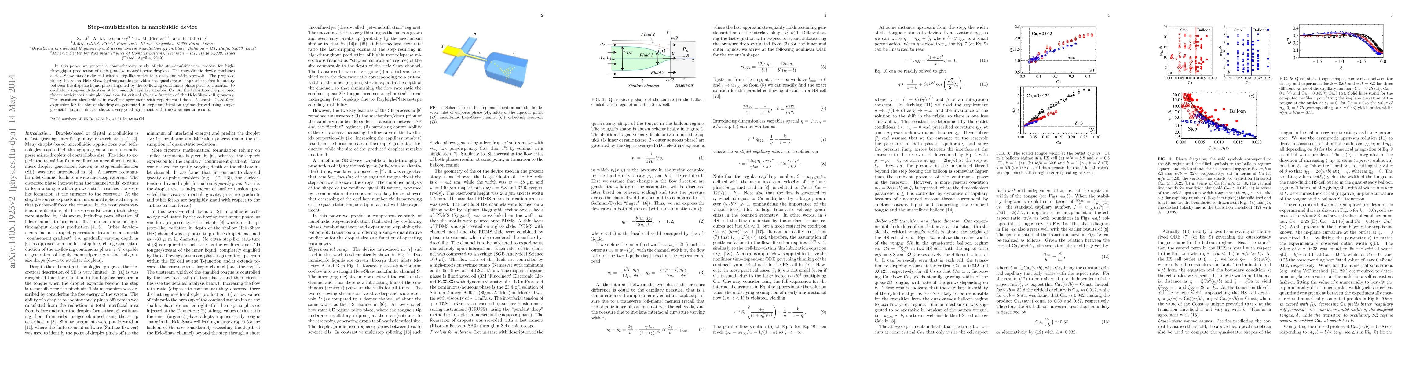 In this paper we present a comprehensive study of the step-emulsification process for high-throughput production of (sub-)$\mu$m-size monodisperse droplets. The microfluidic device combines a Hele-Shaw nanofluidic cell with a step-like outlet to a deep and wide reservoir. The proposed theory based on Hele-Shaw hydrodynamics provides the quasi-static shape of the free boundary between the disperse liquid phase engulfed by the co-flowing continuous phase prior to transition to oscillatory step-emulsification at low enough capillary number. At the transition the proposed theory anticipates a simple condition for critical capillary number as a function of the Hele-Shaw cell geometry. The transition threshold is in excellent agreement with experimental data. A simple closed-form expression for the size of the droplets generated in step-emulsification regime derived using simple geometric arguments also shows a very good agreement with the experimental results.