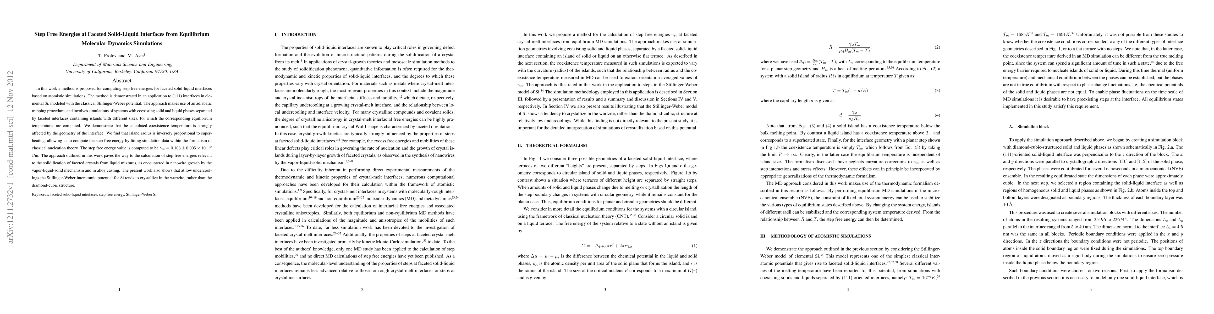 This paper proposes a method for calculating step free energies at faceted solid-liquid interfaces using equilibrium molecular dynamics simulations. It demonstrates the method on Si (111) interfaces, showing that island radius inversely correlates with superheating, enabling the computation of step free energies relevant to nanowire growth and alloy casting.