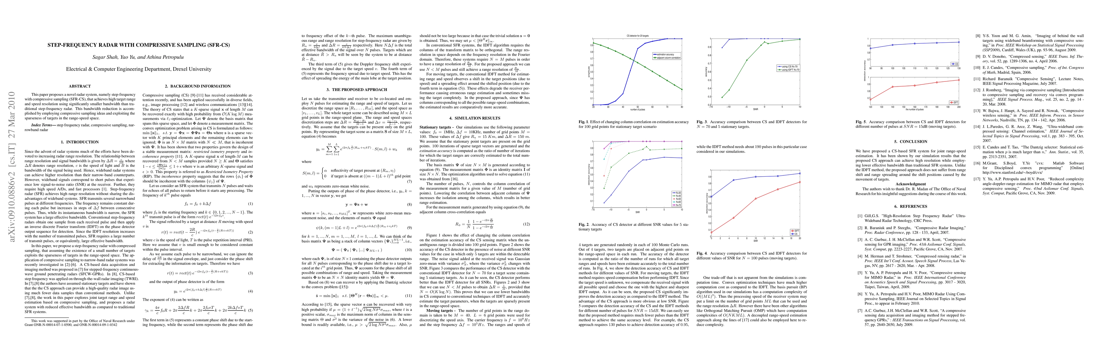 A new radar system called Step-Frequency Radar with Compressive Sampling reduces bandwidth while maintaining high resolution, using fewer pulses than traditional methods. This is achieved through the use of compressive sampling techniques that exploit sparsity in target range velocity space.