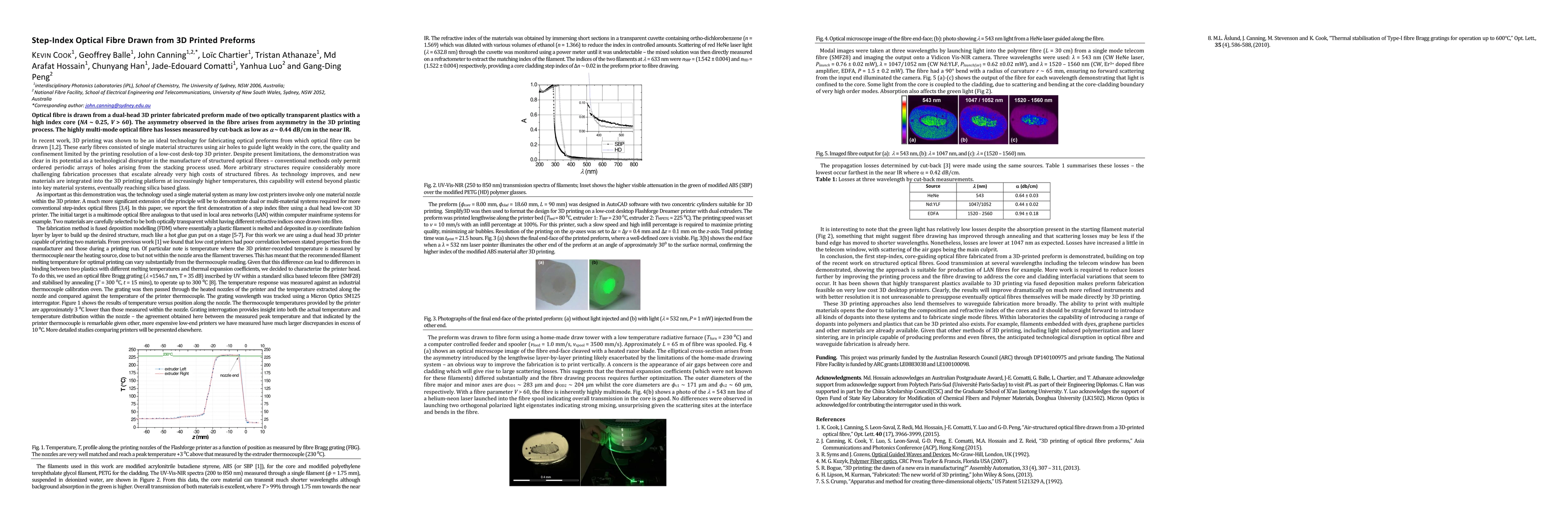 Optical fibre is drawn from a dual-head 3D printer fabricated preform made of two optically transparent plastics with a high index core (NA ~ 0.25, V > 60). The asymmetry observed in the fibre arises from asymmetry in the 3D printing process. The highly multi-mode optical fibre has losses measured by cut-back as low as {\alpha} ~ 0.44 dB/cm in the near IR.