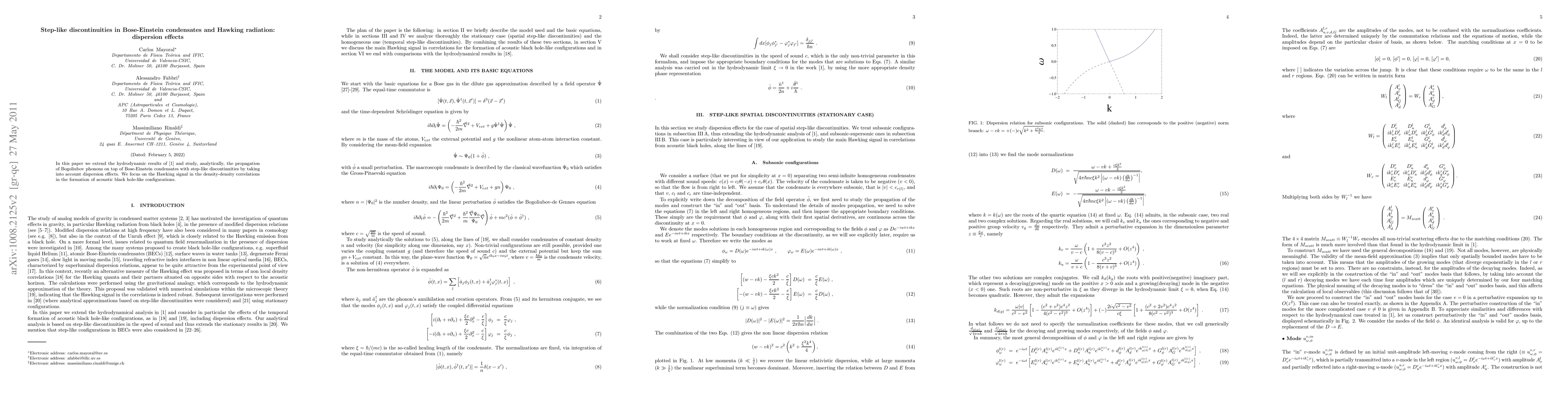 In this paper we extend the hydrodynamic results of [1] and study, analytically, the propagation of Bogoliubov phonons on top of Bose-Einstein condensates with step-like discontinuities by taking into account dispersion effects. We focus on the Hawking signal in the density-density correlations in the formation of acoustic black hole-like configurations.
