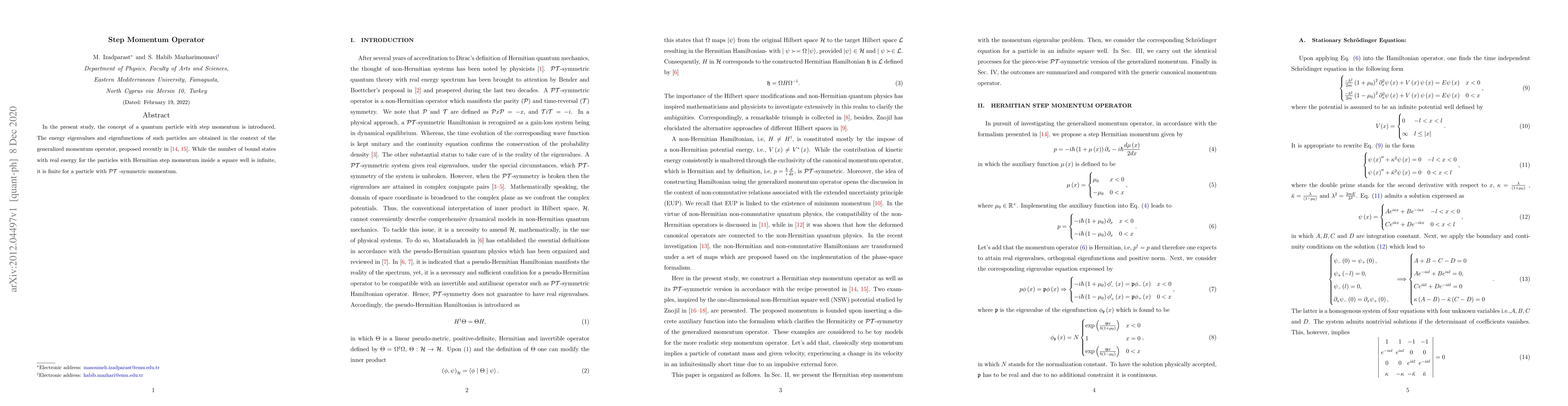 This paper introduces a quantum particle with step momentum and derives its energy eigenvalues and eigenfunctions using a generalized momentum operator. It finds an infinite number of bound states for Hermitian step momentum within a square well, but only a finite number for \mathcal{PT}-symmetric momentum.