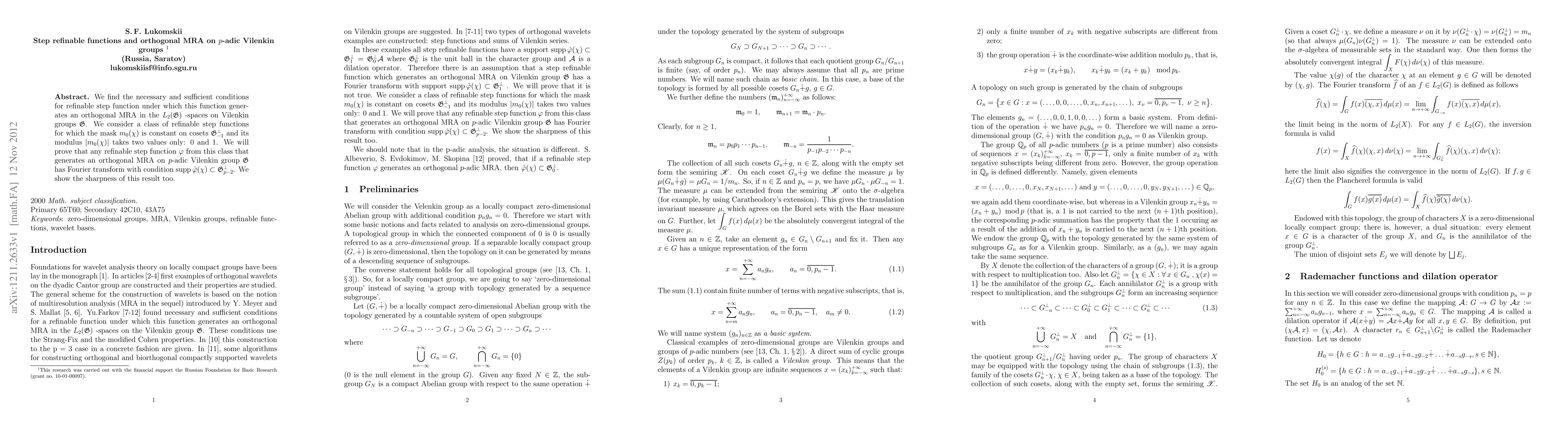 This paper identifies the conditions for refinable step functions to generate an orthogonal multiresolution analysis (MRA) in $L_2(\mathfrak G)$ spaces on Vilenkin groups. It proves that such functions, with constant masks and binary modulus values, must have Fourier transforms supported within $\mathfrak G_{p-2}^\bot$, demonstrating the result's sharpness.