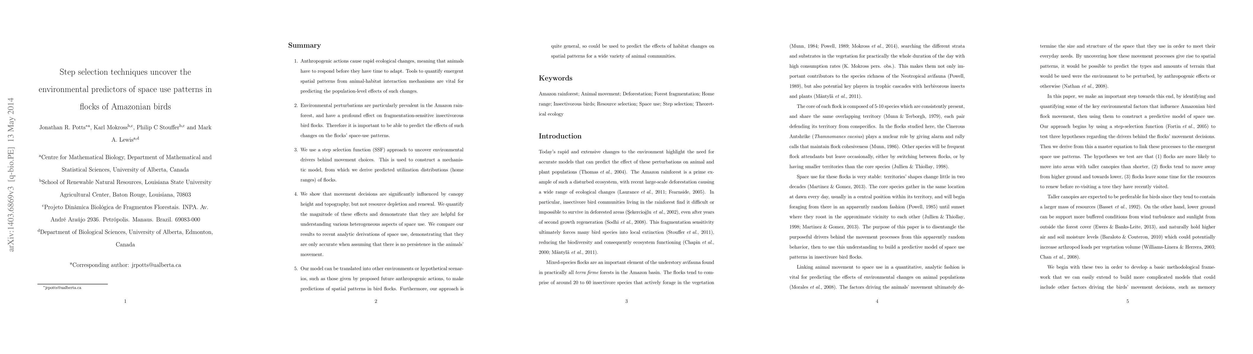 This study employs step selection function techniques to identify environmental predictors influencing the space use patterns of Amazonian bird flocks, revealing significant impacts from canopy height and topography. The findings provide a mechanistic model for predicting the spatial effects of habitat changes, which can be applied to various animal communities and future anthropogenic scenarios.