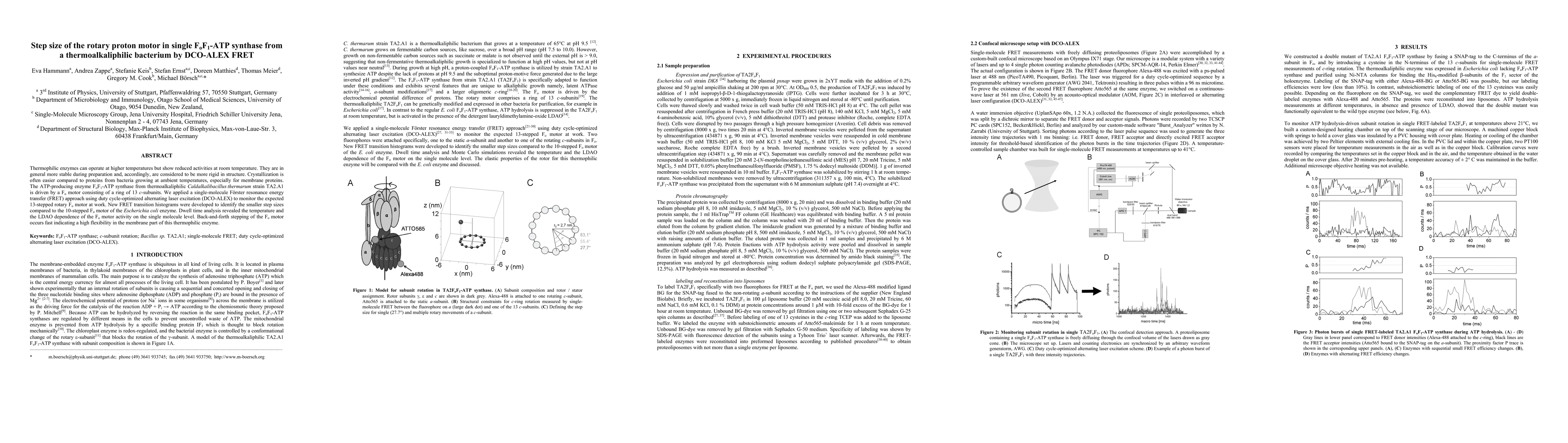 This paper investigates the rotary proton motor of the thermoalkaliphilic FoF1-ATP synthase from Caldalkalibacillus thermarum using DCO-ALEX FRET. It reveals a 13-stepped motor with smaller step sizes compared to the Escherichia coli enzyme, showing high flexibility and fast back-and-forth motion at varying temperatures and detergent concentrations.