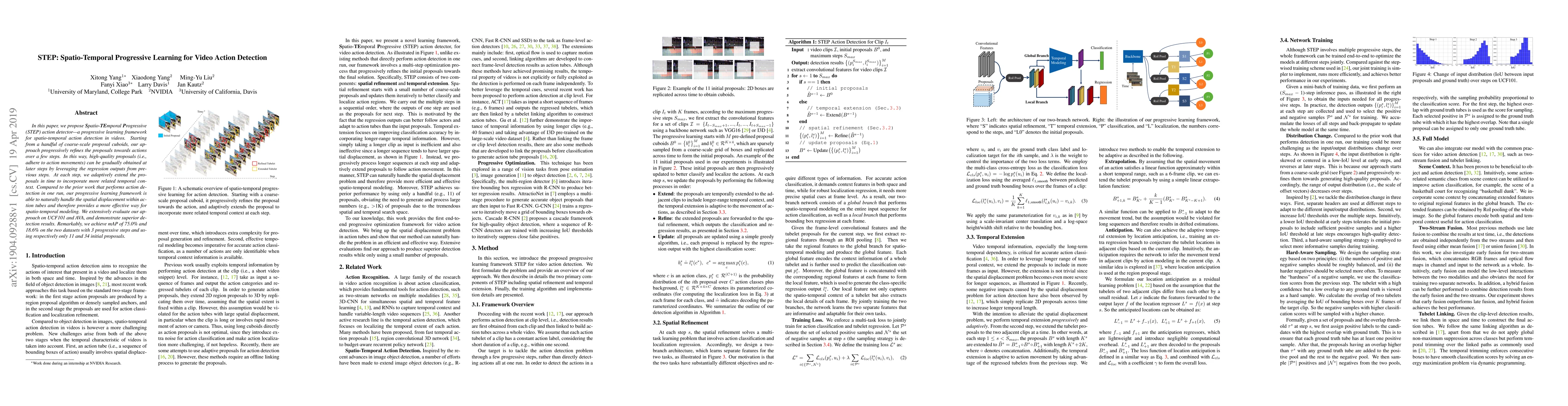 The STEP framework introduces a progressive learning approach for video action detection, refining coarse-scale proposals through iterative refinement steps to achieve high-quality action proposals. This method outperforms single-run approaches by effectively handling spatial displacement and achieving mAP of 75.0% on UCF101 and 18.6% on AVA.