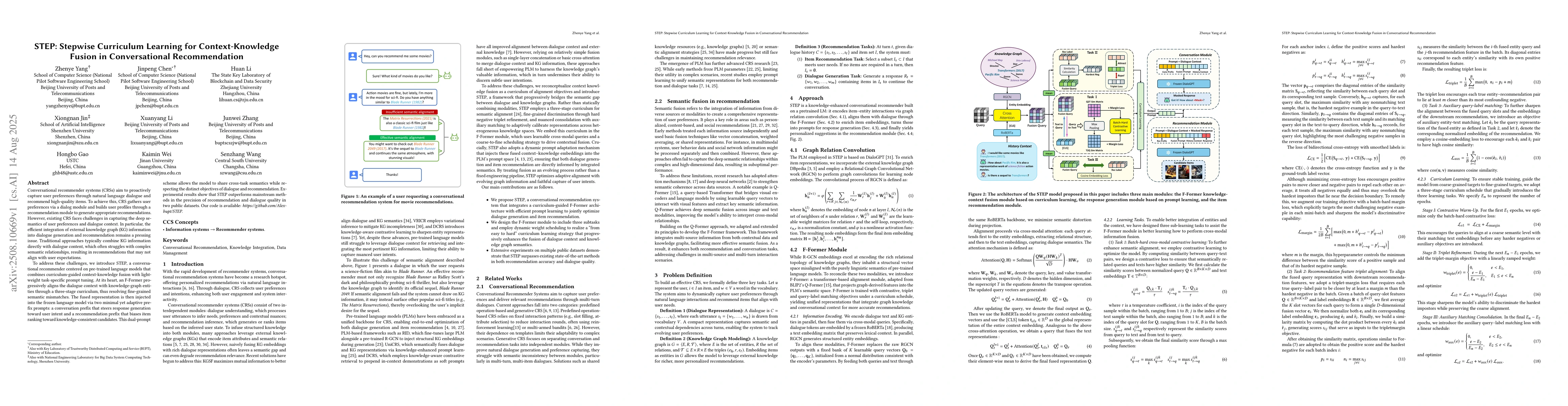 Conversational recommender systems (CRSs) aim to proactively capture user preferences through natural language dialogue and recommend high-quality items. To achieve this, CRS gathers user preferences via a dialog module and builds user profiles through a recommendation module to generate appropriate recommendations. However, existing CRS faces challenges in capturing the deep semantics of user preferences and dialogue context. In particular, the efficient integration of external knowledge graph (KG) information into dialogue generation and recommendation remains a pressing issue. Traditional approaches typically combine KG information directly with dialogue content, which often struggles with complex semantic relationships, resulting in recommendations that may not align with user expectations. To address these challenges, we introduce STEP, a conversational recommender centered on pre-trained language models that combines curriculum-guided context-knowledge fusion with lightweight task-specific prompt tuning. At its heart, an F-Former progressively aligns the dialogue context with knowledge-graph entities through a three-stage curriculum, thus resolving fine-grained semantic mismatches. The fused representation is then injected into the frozen language model via two minimal yet adaptive prefix prompts: a conversation prefix that steers response generation toward user intent and a recommendation prefix that biases item ranking toward knowledge-consistent candidates. This dual-prompt scheme allows the model to share cross-task semantics while respecting the distinct objectives of dialogue and recommendation. Experimental results show that STEP outperforms mainstream methods in the precision of recommendation and dialogue quality in two public datasets.