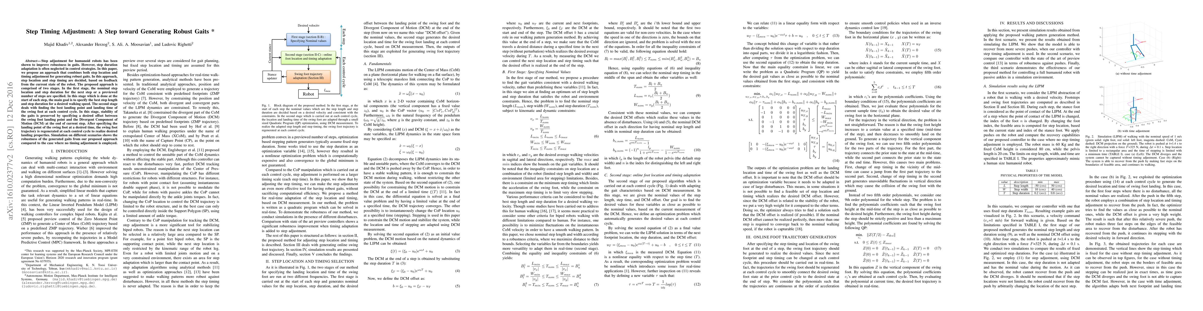 This paper proposes an approach for humanoid robots that combines step location and timing adjustment to generate robust gaits. The method involves two stages: initial specification of step length and duration, followed by real-time adjustment of swing foot landing point and time to maintain stability, demonstrating improved robustness in simulations.