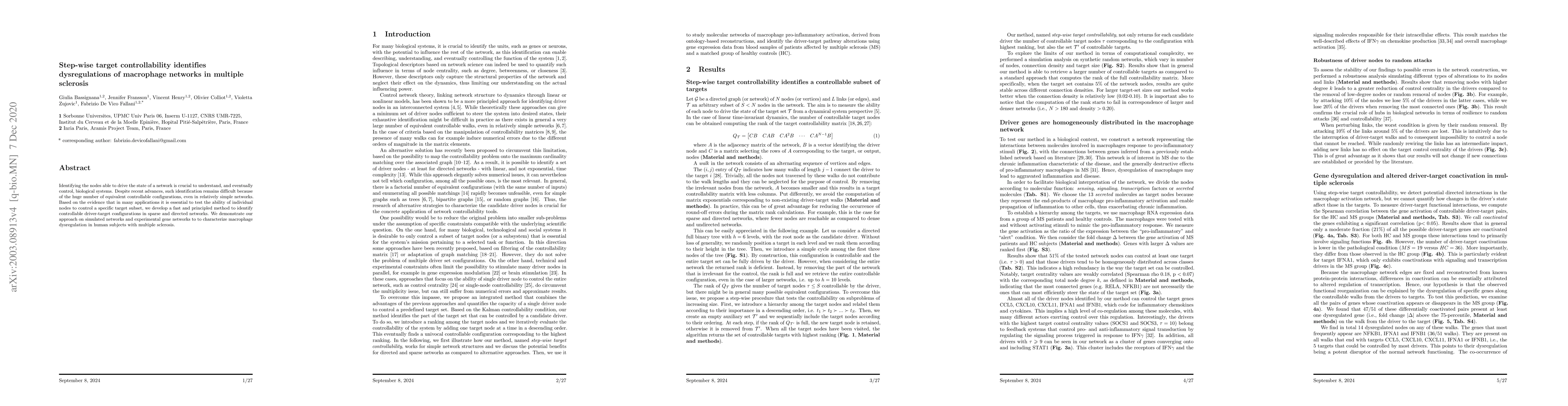 This paper proposes a step-wise target controllability method to identify key nodes influencing macrophage networks in multiple sclerosis. The method efficiently identifies driver-target configurations in sparse networks, revealing dysregulated pathways associated with macrophage dysfunction, with distinct patterns observed in multiple sclerosis patients compared to healthy controls.