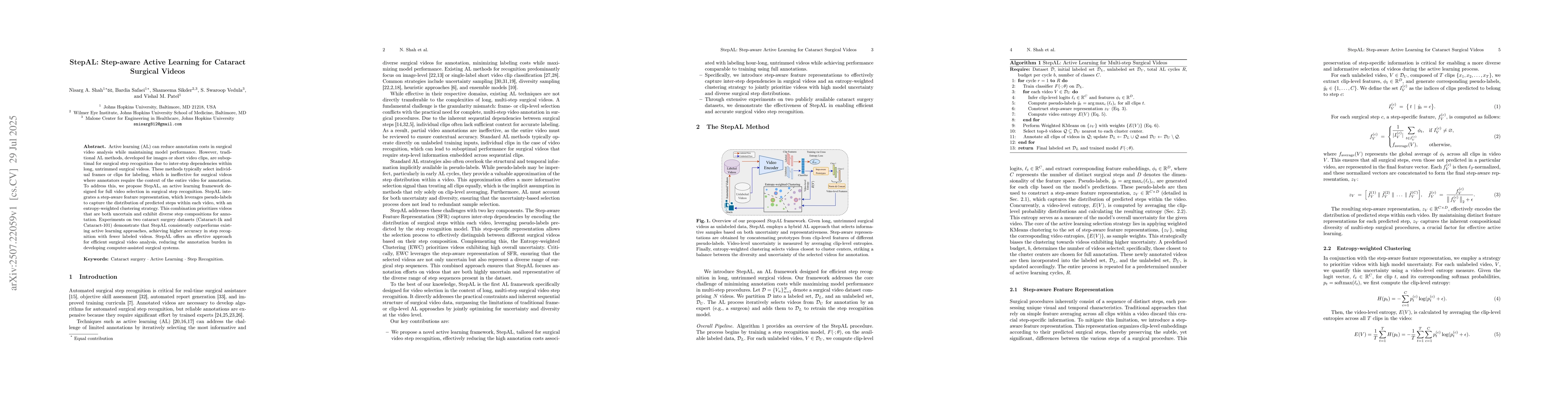 The research proposes StepAL, an active learning framework for full video selection in surgical step recognition, integrating step-aware feature representation with entropy-weighted clustering to prioritize uncertain and diverse videos for annotation.