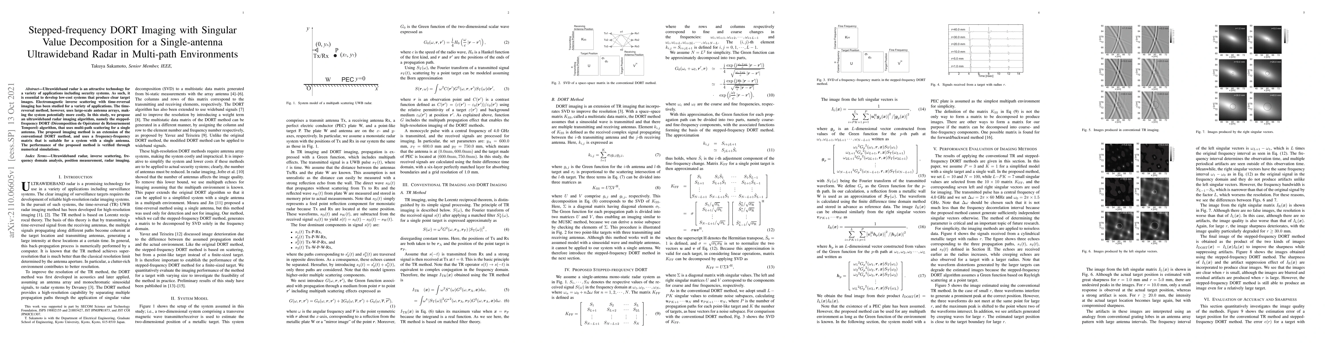 This paper proposes a stepped-frequency DORT imaging algorithm for a single-antenna ultrawideband radar, utilizing multi-path scattering to produce clear target images in a cost-effective manner. The method extends the conventional DORT algorithm and employs singular value decomposition for improved performance, validated through numerical simulations.