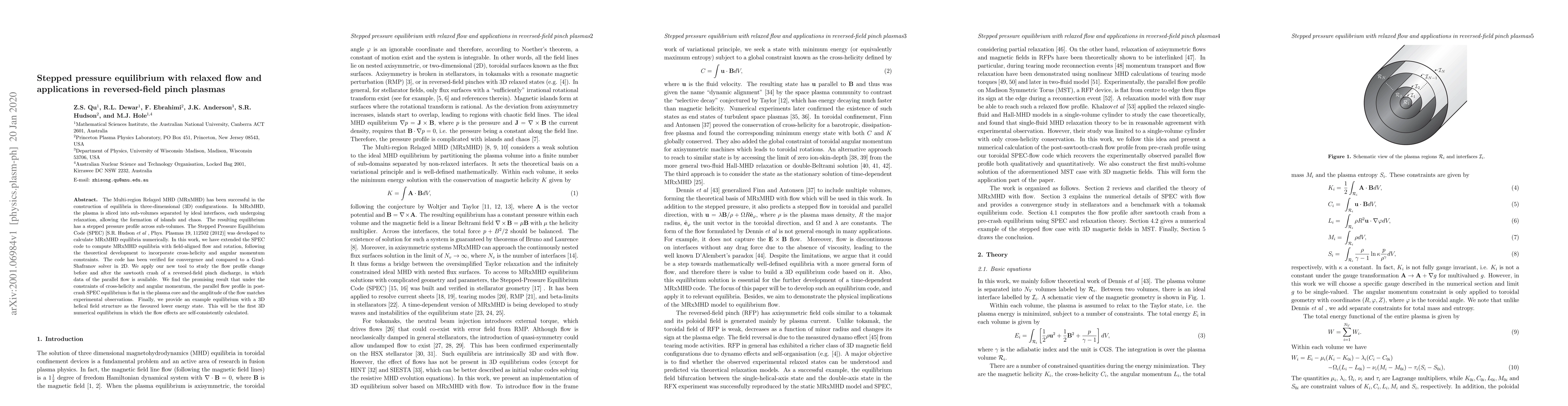 The Multi-region Relaxed MHD (MRxMHD) has been successful in the construction of equilibria in three-dimensional (3D) configurations. In MRxMHD, the plasma is sliced into sub-volumes separated by ideal interfaces, each undergoing relaxation, allowing the formation of islands and chaos. The resulting equilibrium has a stepped pressure profile across sub-volumes. The Stepped Pressure Equilibrium Code (SPEC) [S.R. Hudson et al., Phys. Plasmas 19, 112502 (2012)] was developed to calculate MRxMHD equilibria numerically. In this work, we have extended the SPEC code to compute MRxMHD equilibria with field-aligned flow and rotation, following the theoretical development to incorporate cross-helicity and angular momentum constraints. The code has been verified for convergence and compared to a Grad-Shafranov solver in 2D. We apply our new tool to study the flow profile change before and after the sawtooth crash of a reversed-field pinch discharge, in which data of the parallel flow is available. We find the promising result that under the constraints of cross-helicity and angular momentum, the parallel flow profile in post-crash SPEC equilibrium is flat in the plasma core and the amplitude of the flow matches experimental observations. Finally, we provide an example equilibrium with a 3D helical field structure as the favoured lower energy state. This will be the first 3D numerical equilibrium in which the flow effects are self-consistently calculated.