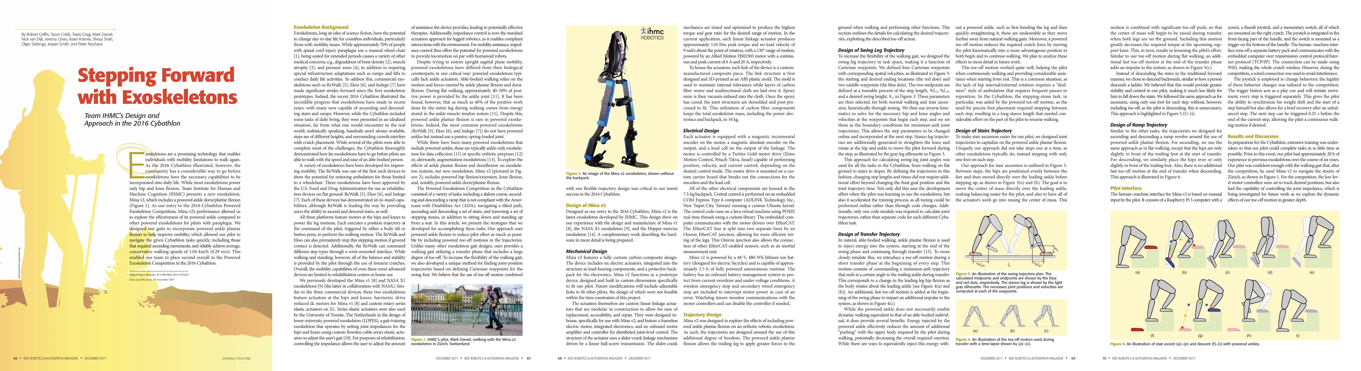 Team IHMC's Mina v2 exoskeleton, featuring powered ankle dorsi/plantar flexion, enabled a pilot with paraplegia to achieve average walking speeds of 1.04 km/h in the 2016 Cybathlon, securing second place in the Powered Exoskeleton Competition. The design focused on improving mobility through powered ankle plantar flexion.
