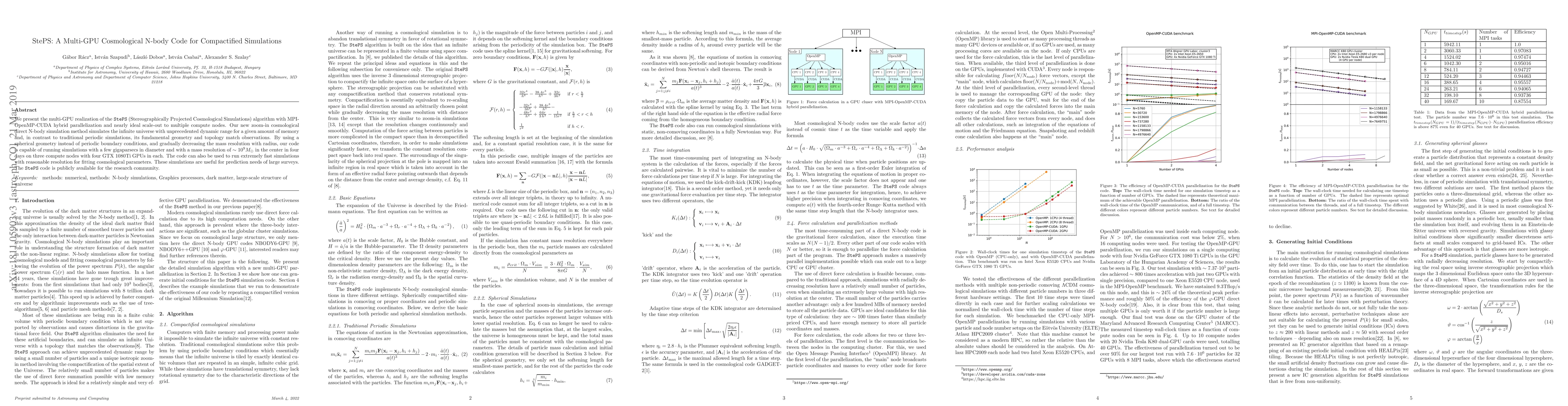 StePS is a multi-GPU N-body simulation code utilizing hybrid parallelization for cosmological simulations, offering a spherical geometry that matches observational data. It achieves high dynamic range and resolution, enabling simulations of large-scale universes in a fraction of the time compared to traditional methods.