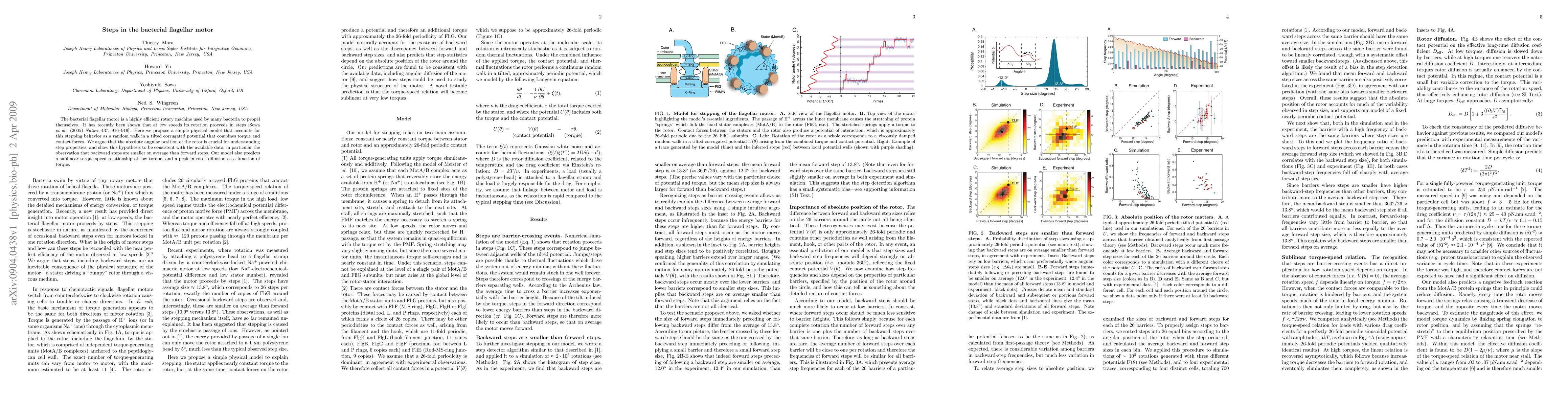 The bacterial flagellar motor is a highly efficient rotary machine used by many bacteria to propel themselves. It has recently been shown that at low speeds its rotation proceeds in steps [Sowa et al. (2005) Nature 437, 916--919]. Here we propose a simple physical model that accounts for this stepping behavior as a random walk in a tilted corrugated potential that combines torque and contact forces. We argue that the absolute angular position of the rotor is crucial for understanding step properties, and show this hypothesis to be consistent with the available data, in particular the observation that backward steps are smaller on average than forward steps. Our model also predicts a sublinear torque-speed relationship at low torque, and a peak in rotor diffusion as a function of torque.