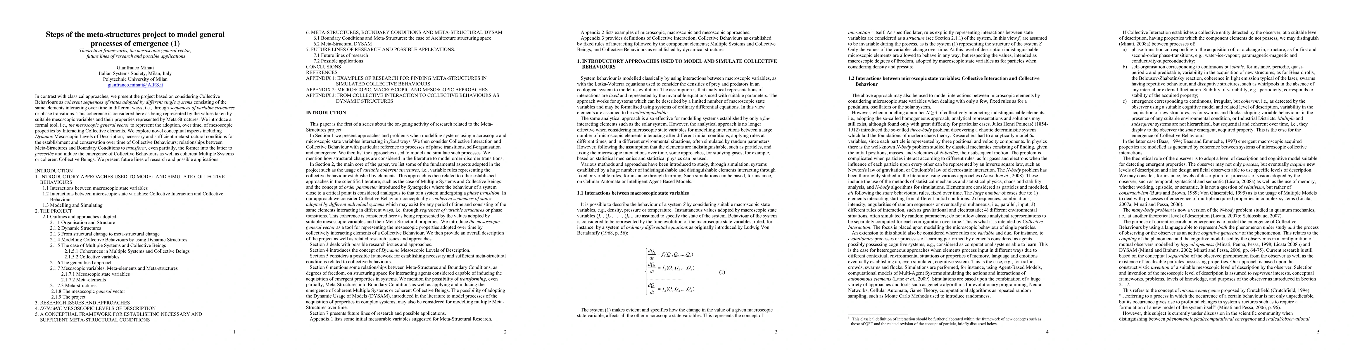 This paper proposes a meta-structures project to model the emergence of collective behaviors through variable structures and phase transitions. It introduces a mesoscopic general vector to represent the temporal adoption of mesoscopic properties by interacting collective elements, exploring dynamic levels of description and conditions for the emergence of coherent collective behaviors.