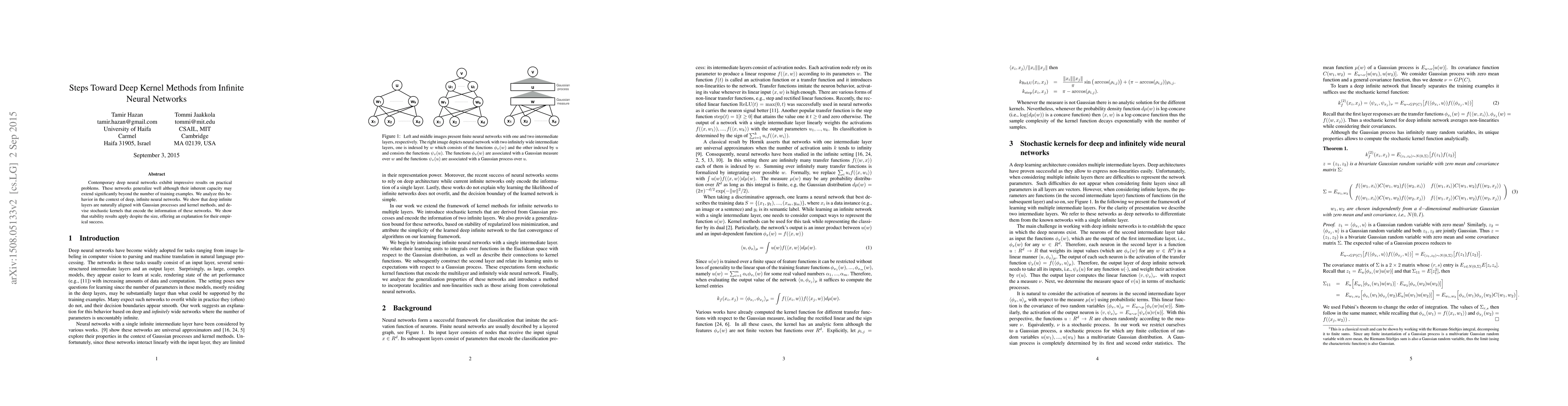 This paper explores the connection between deep neural networks and infinite neural networks, demonstrating that deep infinite layers align with Gaussian processes and kernel methods. It introduces stochastic kernels to encode this information, explaining the empirical success of deep networks through stability results.