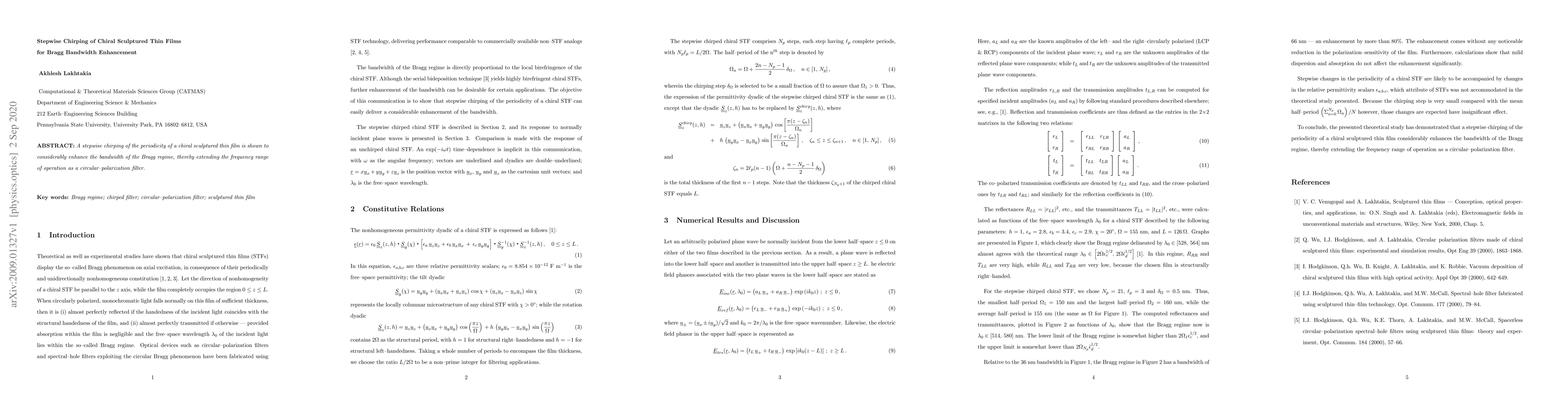 This paper demonstrates that introducing a stepwise chirp in the periodicity of chiral sculptured thin films significantly broadens the Bragg regime bandwidth, thus expanding the operational frequency range for circular polarization filtering applications.