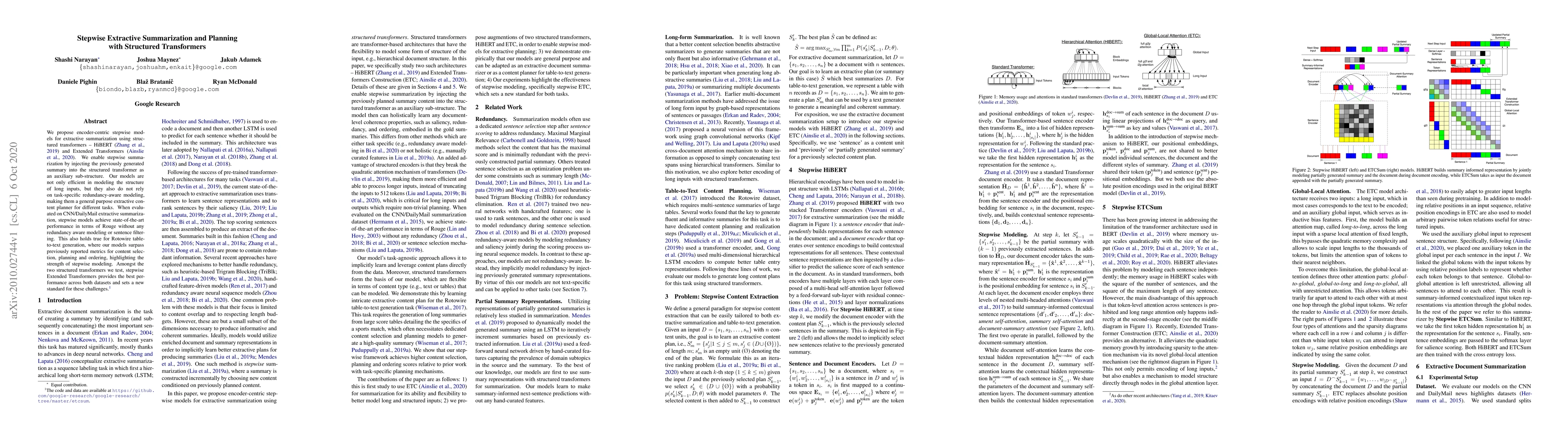 We propose encoder-centric stepwise models for extractive summarization using structured transformers -- HiBERT and Extended Transformers. We enable stepwise summarization by injecting the previously generated summary into the structured transformer as an auxiliary sub-structure. Our models are not only efficient in modeling the structure of long inputs, but they also do not rely on task-specific redundancy-aware modeling, making them a general purpose extractive content planner for different tasks. When evaluated on CNN/DailyMail extractive summarization, stepwise models achieve state-of-the-art performance in terms of Rouge without any redundancy aware modeling or sentence filtering. This also holds true for Rotowire table-to-text generation, where our models surpass previously reported metrics for content selection, planning and ordering, highlighting the strength of stepwise modeling. Amongst the two structured transformers we test, stepwise Extended Transformers provides the best performance across both datasets and sets a new standard for these challenges.
