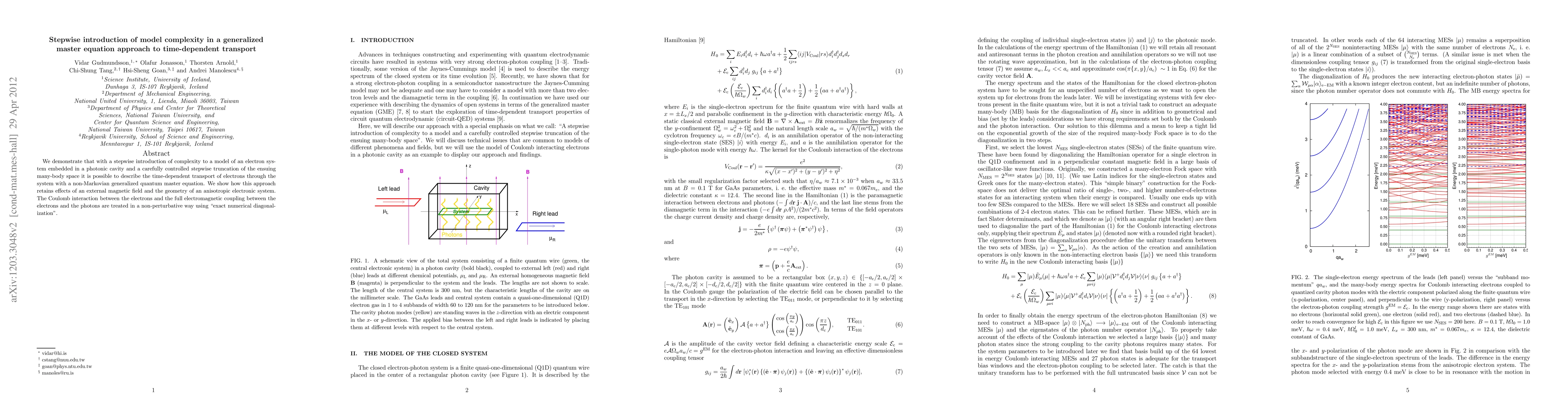 This paper introduces a stepwise complexity model to describe time-dependent electron transport in photonic cavities using a non-Markovian quantum master equation. The approach accounts for external magnetic fields, anisotropic geometry, and treats Coulomb interactions and electromagnetic coupling non-perturbatively via exact numerical diagonalization.