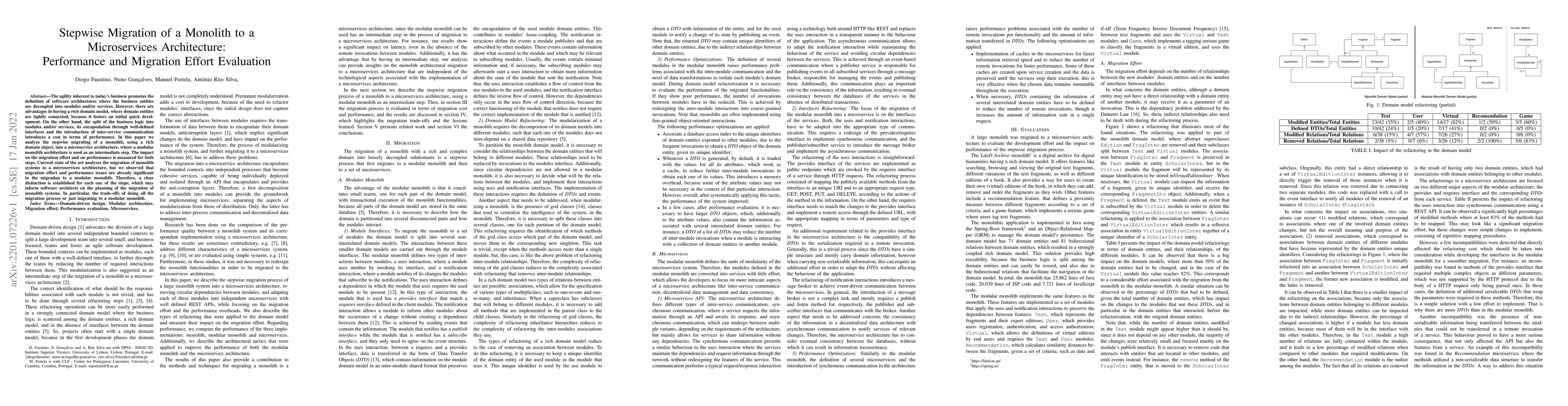 The agility inherent to today's business promotes the definition of software architectures where the business entities are decoupled into modules and/or services. However, there are advantages in having a rich domain model, where domain entities are tightly connected, because it fosters an initial quick development. On the other hand, the split of the business logic into modules and/or services, its encapsulation through well-defined interfaces and the introduction of inter-service communication introduces a cost in terms of performance. In this paper we analyze the stepwise migrating of a monolith, using a rich domain object, into a microservice architecture, where a modular monolith architecture is used as an intermediate step. The impact on the migration effort and on performance is measured for both steps. Current state of the art analyses the migration of monolith systems to a microservices architecture, but we observed that migration effort and performance issues are already significant in the migration to a modular monolith. Therefore, a clear distinction is established for each one of the steps, which may inform software architects on the planning of the migration of monolith systems. In particular, the trade-offs of doing all the migration process or just migrating to a modular monolith.