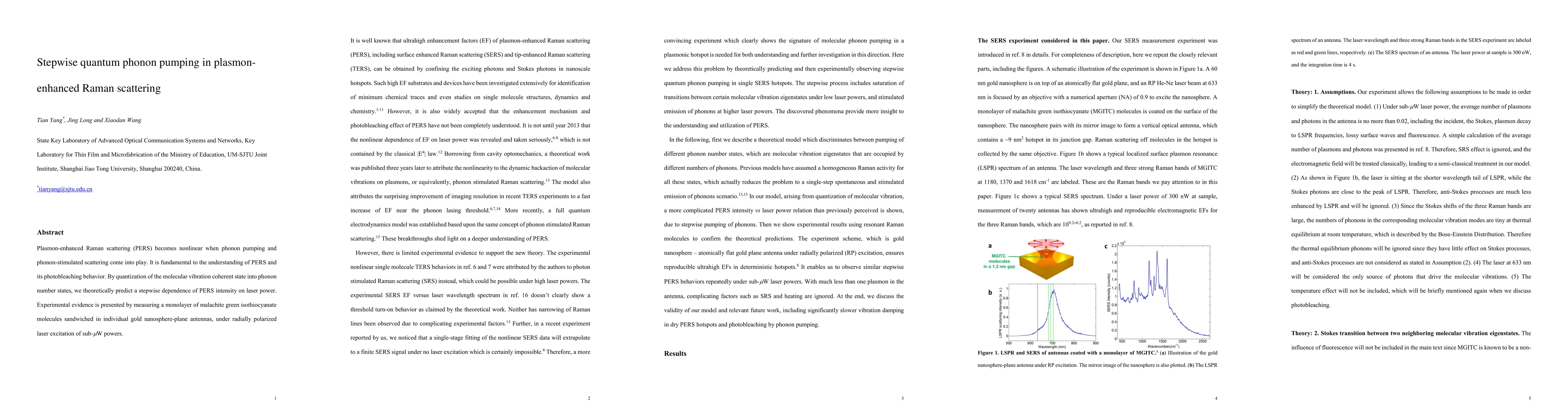 Summary: This study presents a theoretical prediction of stepwise quantum phonon pumping in plasmon-enhanced Raman scattering (PERS) due to coherent molecular vibration quantization. Experimental verification is achieved using a monolayer of malachite green isothiocyanate molecules within gold nanosphere antennas, showing PERS intensity's dependence on sub-microWatt laser power.