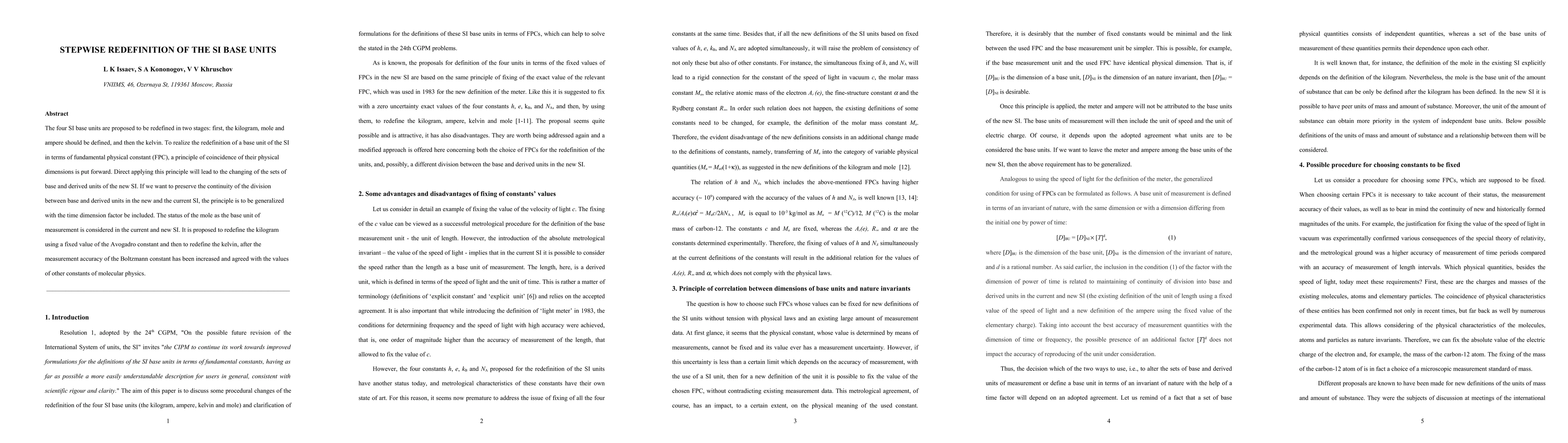 The four SI base units are proposed to be redefined in two stages: first, the kilogram, mole and ampere should be defined, and then the kelvin. To realize the redefinition of a base unit of the SI in terms of fundamental physical constant (FPC), a principle of coincidence of their physical dimensions is put forward. Direct applying this principle will lead to the changing of the sets of base and derived units in the new SI. If we want to preserve the continuity of the division between base and derived units in the new and the current SI, the principle is to be generalized with the time dimension factor be included. The status of the mole as the base unit of measurement is considered in the current and new SI. It is proposed to redefine the kilogram using a fixed value of the Avogadro constant and then to redefine the kelvin, after the measurement accuracy of the Boltzmann constant has been increased and agreed with the values of other constants of molecular physics.