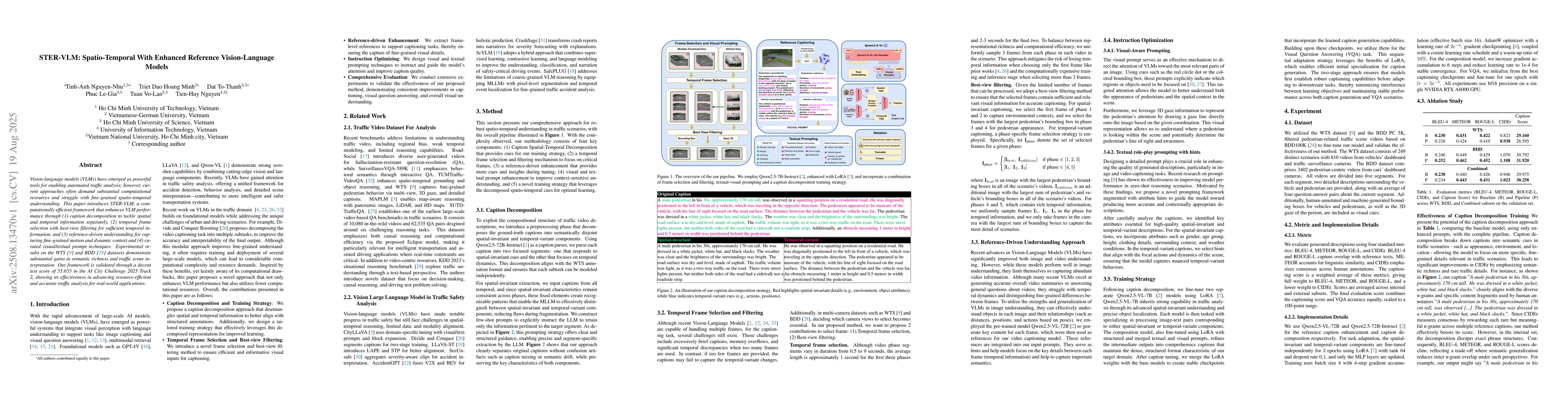 The paper introduces STER-VLM, a computationally efficient framework for traffic analysis that decomposes captions into spatial and temporal information, selects optimal temporal frames, and uses reference-driven understanding for fine-grained motion and context capture.