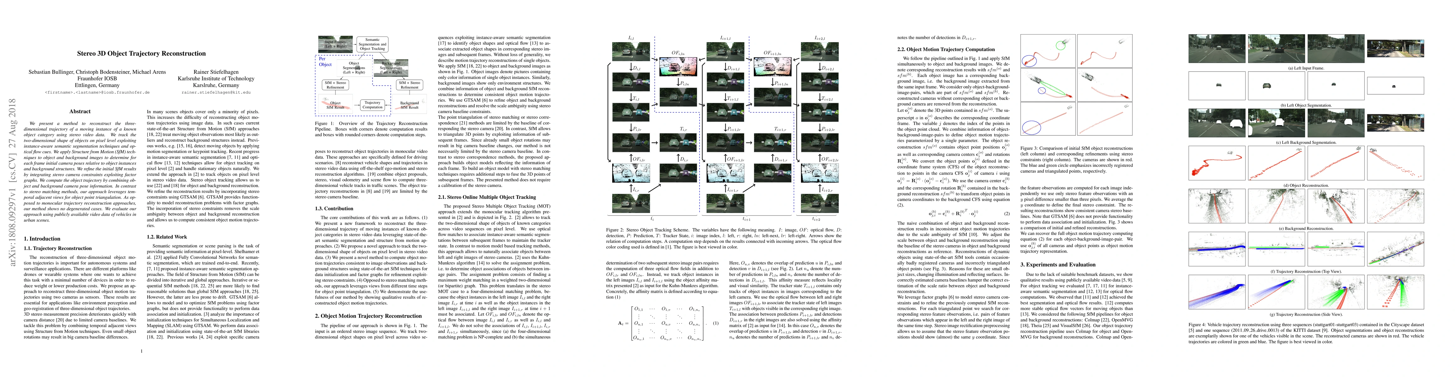 We present a method to reconstruct the three-dimensional trajectory of a moving instance of a known object category using stereo video data. We track the two-dimensional shape of objects on pixel level exploiting instance-aware semantic segmentation techniques and optical flow cues. We apply Structure from Motion (SfM) techniques to object and background images to determine for each frame initial camera poses relative to object instances and background structures. We refine the initial SfM results by integrating stereo camera constraints exploiting factor graphs. We compute the object trajectory by combining object and background camera pose information. In contrast to stereo matching methods, our approach leverages temporal adjacent views for object point triangulation. As opposed to monocular trajectory reconstruction approaches, our method shows no degenerated cases. We evaluate our approach using publicly available video data of vehicles in urban scenes.