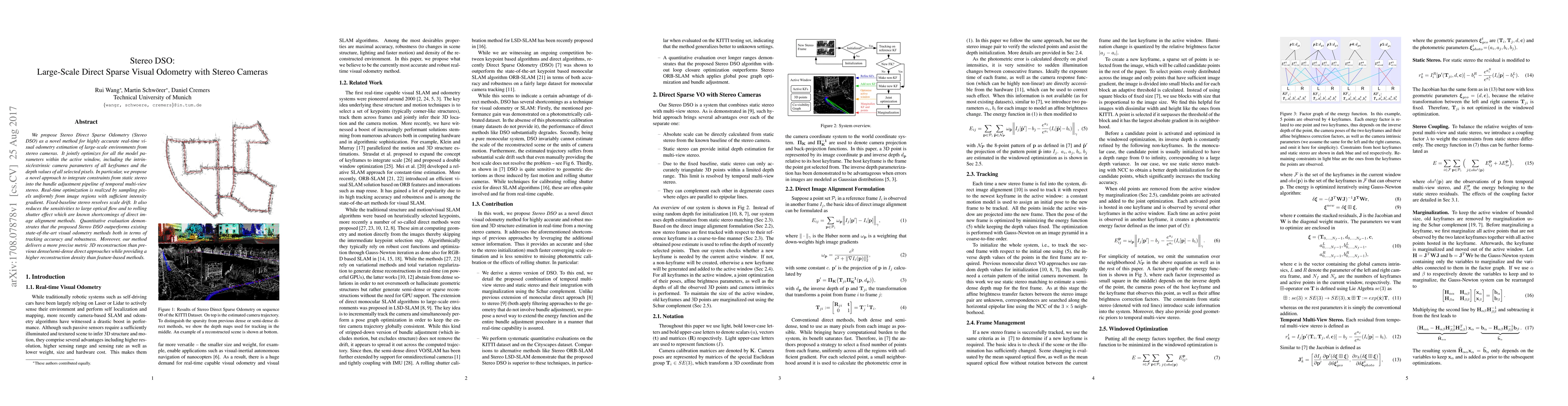 Stereo DSO is a novel method for large-scale real-time visual odometry using stereo cameras, optimizing camera parameters and pixel depths within an active window. It outperforms existing methods in accuracy and robustness, providing precise metric 3D reconstruction with higher density than feature-based approaches.