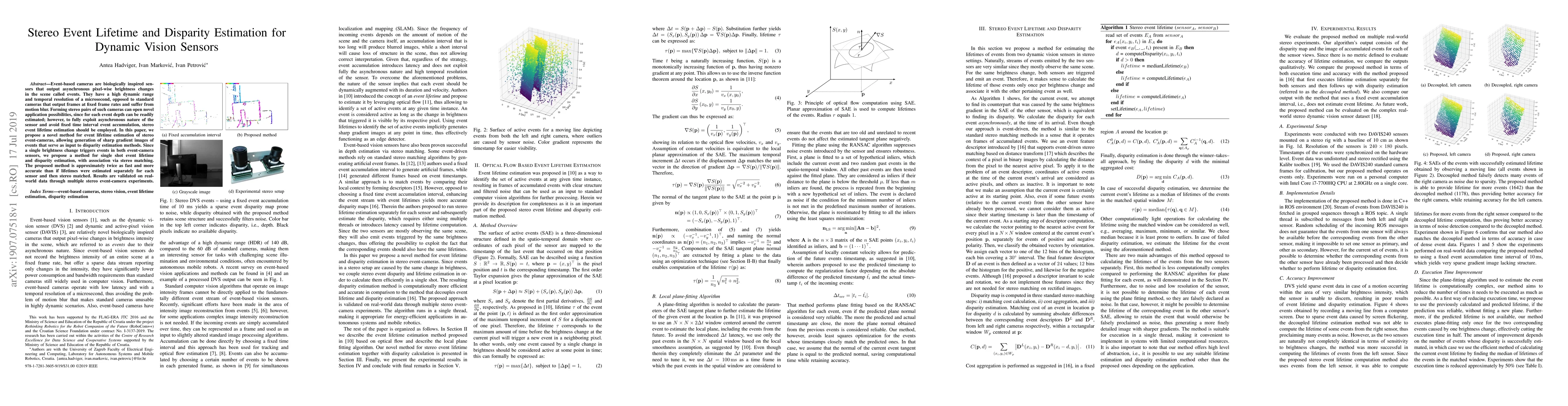 This paper proposes a novel method for estimating event lifetimes in stereo event-based cameras to generate sharp gradient images, which are then used for disparity estimation. The method allows for single-shot estimation and association via stereo matching, resulting in faster and more accurate results compared to separate lifetime estimation and stereo matching.