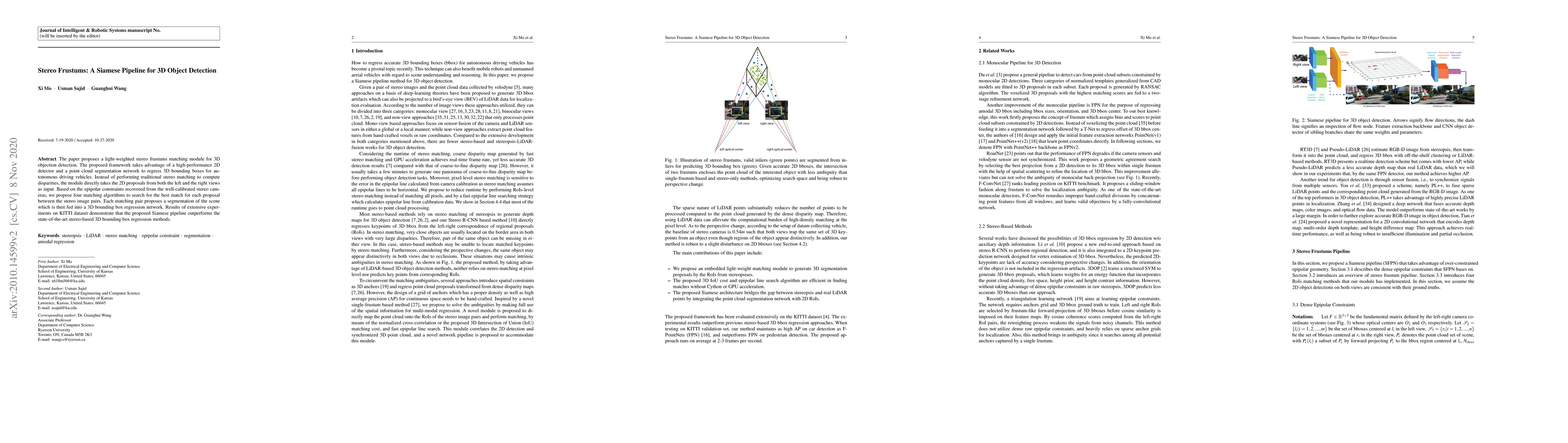 The paper introduces a lightweight stereo frustums matching module for 3D object detection, utilizing a 2D detector and point cloud segmentation network to regress 3D bounding boxes. The proposed Siamese pipeline outperforms existing stereo-based methods on the KITTI dataset.
