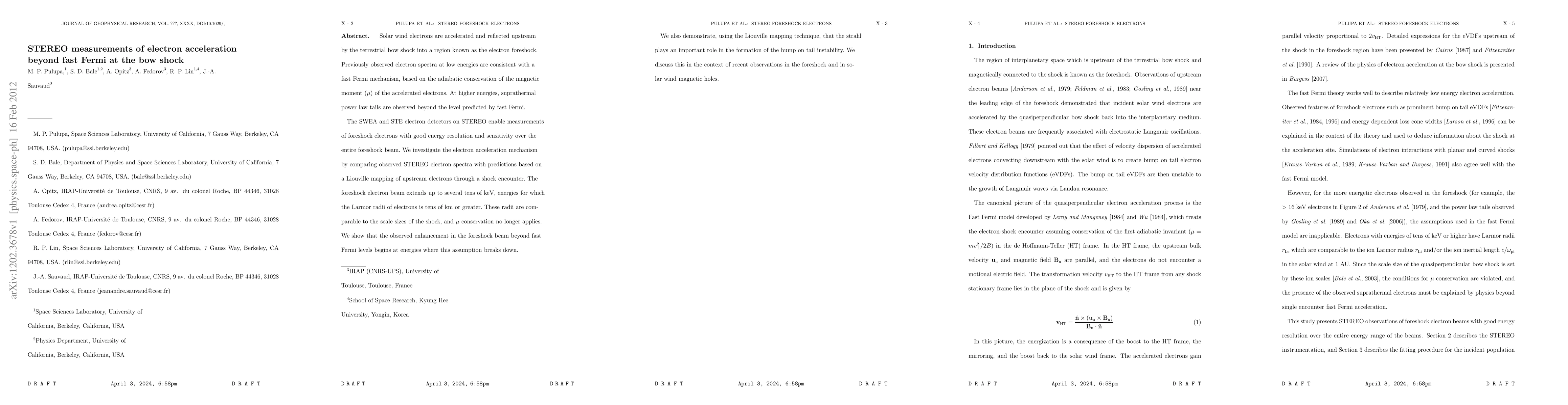 This paper investigates electron acceleration beyond the fast Fermi mechanism at the bow shock using STEREO measurements, finding that the enhancement in electron spectra occurs at energies where magnetic moment conservation breaks down. The study uses Liouville mapping to show the strahl's role in the bump-on-tail instability formation.