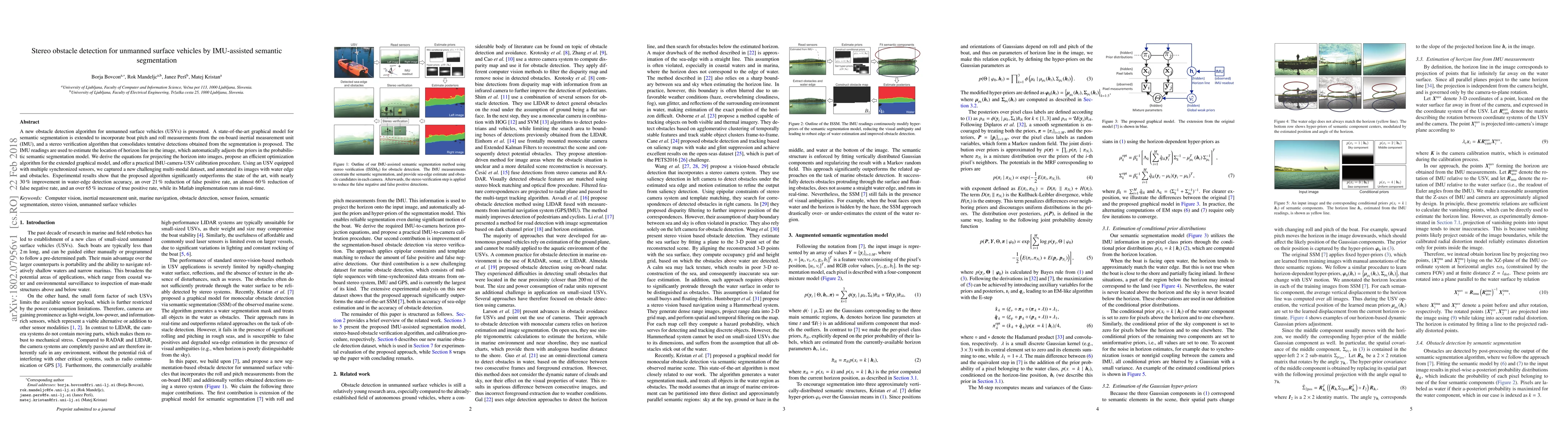 A new obstacle detection algorithm for unmanned surface vehicles (USVs) is presented. A state-of-the-art graphical model for semantic segmentation is extended to incorporate boat pitch and roll measurements from the on-board inertial measurement unit (IMU), and a stereo verification algorithm that consolidates tentative detections obtained from the segmentation is proposed. The IMU readings are used to estimate the location of horizon line in the image, which automatically adjusts the priors in the probabilistic semantic segmentation model. We derive the equations for projecting the horizon into images, propose an efficient optimization algorithm for the extended graphical model, and offer a practical IMU-camera-USV calibration procedure. Using an USV equipped with multiple synchronized sensors, we captured a new challenging multi-modal dataset, and annotated its images with water edge and obstacles. Experimental results show that the proposed algorithm significantly outperforms the state of the art, with nearly 30% improvement in water-edge detection accuracy, an over 21% reduction of false positive rate, an almost 60% reduction of false negative rate, and an over 65% increase of true positive rate, while its Matlab implementation runs in real-time.