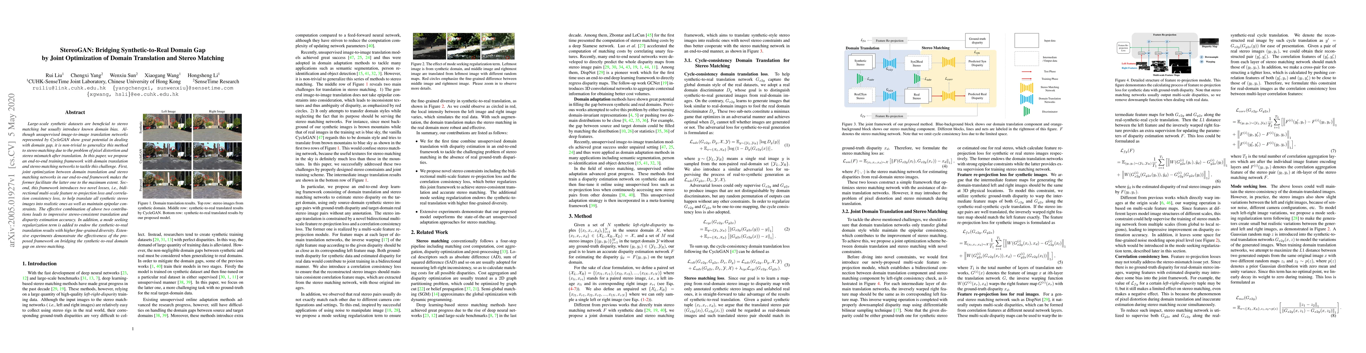 The paper proposes StereoGAN, an end-to-end training framework that jointly optimizes domain translation and stereo matching networks to bridge the synthetic-to-real domain gap, introducing novel losses and regularization to enhance translation accuracy and disparity estimation. Experiments show significant improvements in stereo-consistent translation and disparity estimation.