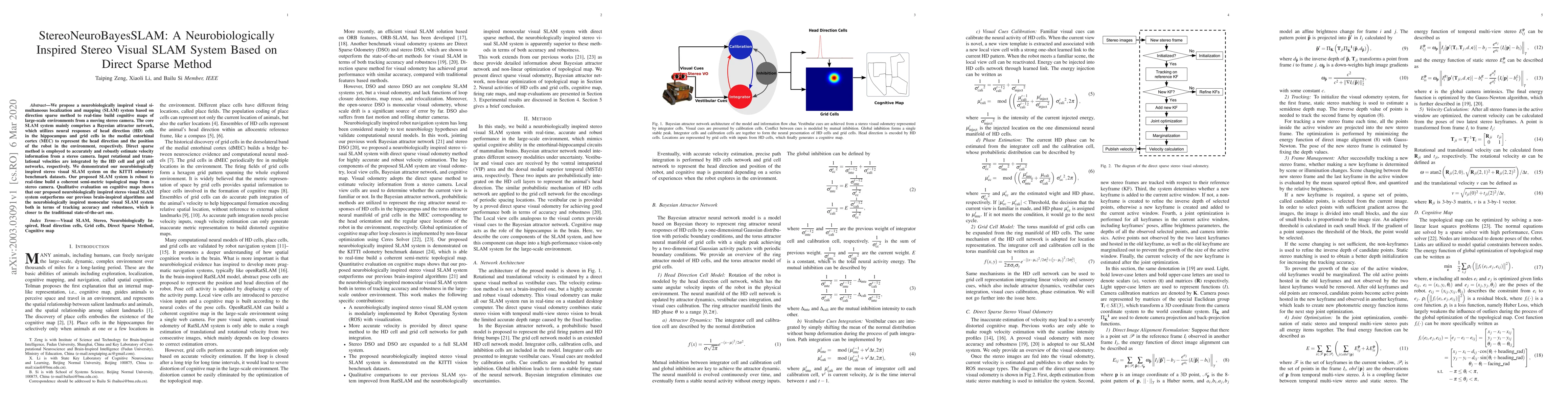 This paper introduces a neurobiologically inspired stereo visual SLAM system that employs a Bayesian attractor network mimicking head direction and grid cells to represent robot orientation and position. The system uses direct sparse methods for robust velocity estimation from stereo cameras, demonstrating superior tracking accuracy and robustness compared to previous brain-inspired algorithms and a monocular SLAM system.
