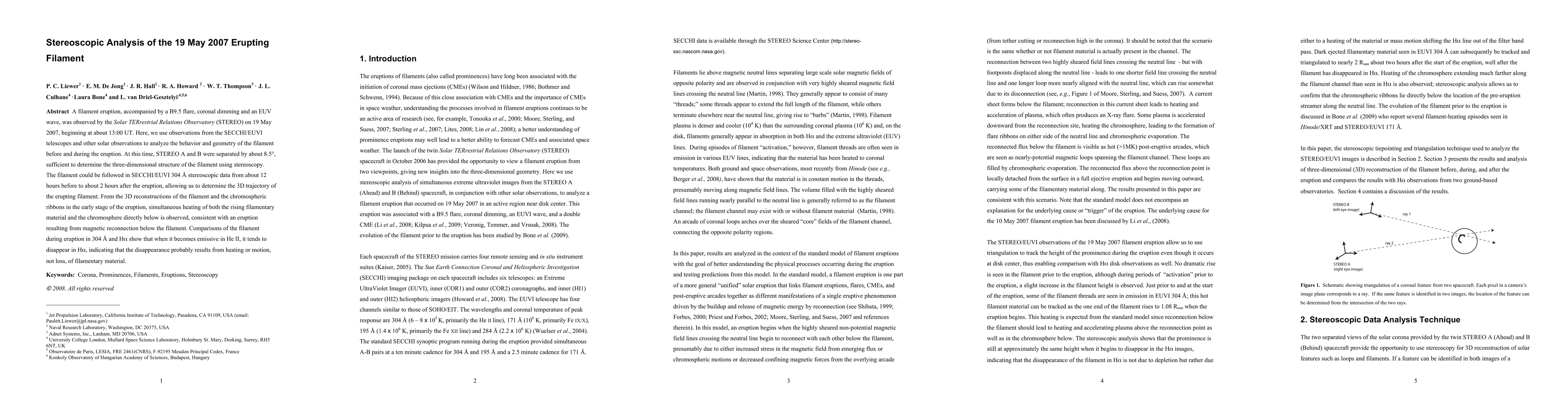 This study uses stereoscopic data from the STEREO observatories to analyze the 3D structure and behavior of a filament that erupted on 19 May 2007, accompanied by a B9.5 flare. The research reveals the filament's 3D trajectory and suggests that its eruption resulted from magnetic reconnection, with heating observed in both the filament and the chromosphere.