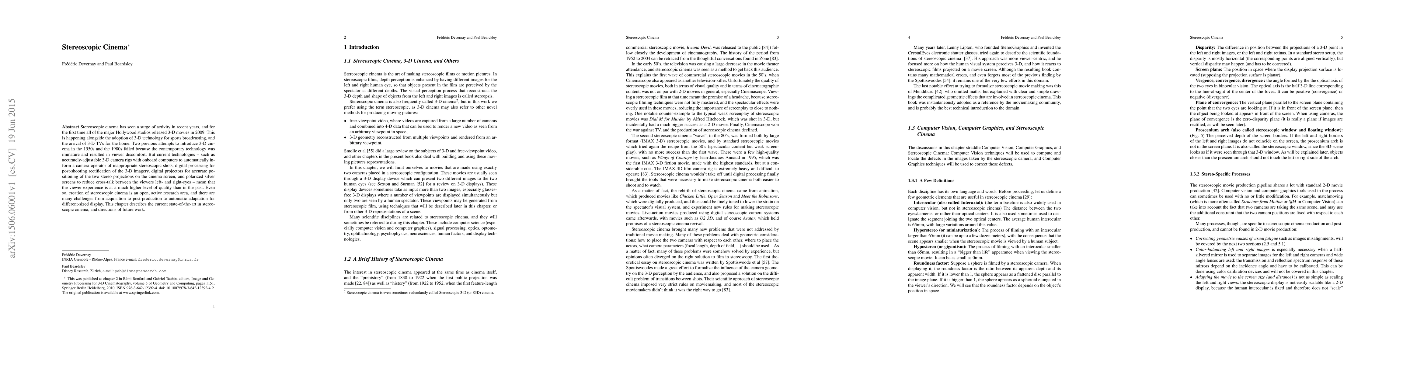 Stereoscopic cinema has experienced a resurgence with recent advancements in 3-D technology, leading to major Hollywood studios releasing 3-D movies in 2009. Current technology significantly improves the viewer experience compared to previous attempts, but ongoing research addresses challenges from production to adaptation for various displays.