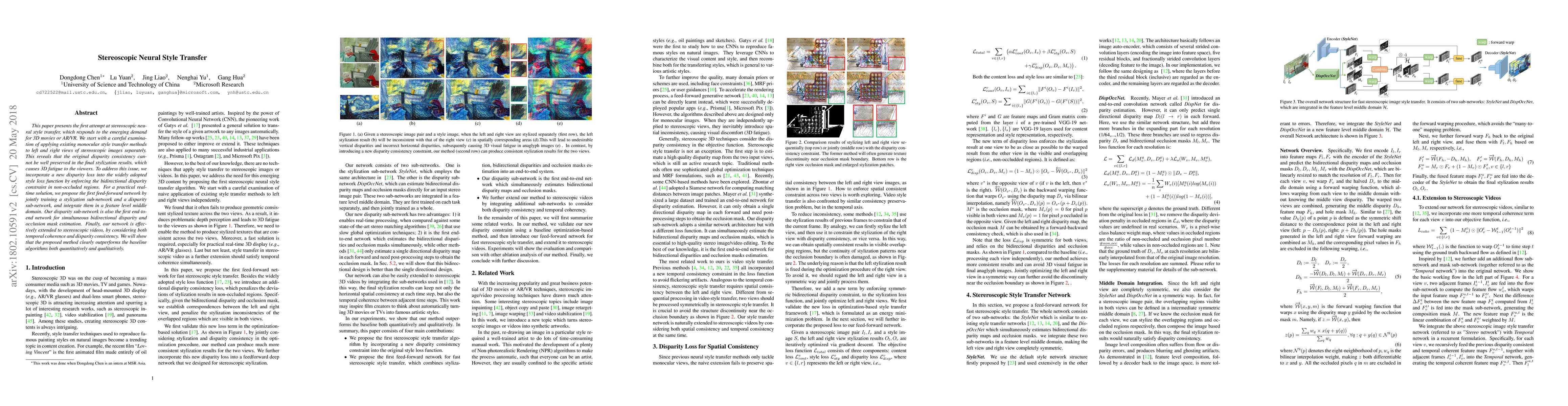 This paper presents the first attempt at stereoscopic neural style transfer, which responds to the emerging demand for 3D movies or AR/VR. We start with a careful examination of applying existing monocular style transfer methods to left and right views of stereoscopic images separately. This reveals that the original disparity consistency cannot be well preserved in the final stylization results, which causes 3D fatigue to the viewers. To address this issue, we incorporate a new disparity loss into the widely adopted style loss function by enforcing the bidirectional disparity constraint in non-occluded regions. For a practical real-time solution, we propose the first feed-forward network by jointly training a stylization sub-network and a disparity sub-network, and integrate them in a feature level middle domain. Our disparity sub-network is also the first end-to-end network for simultaneous bidirectional disparity and occlusion mask estimation. Finally, our network is effectively extended to stereoscopic videos, by considering both temporal coherence and disparity consistency. We will show that the proposed method clearly outperforms the baseline algorithms both quantitatively and qualitatively.