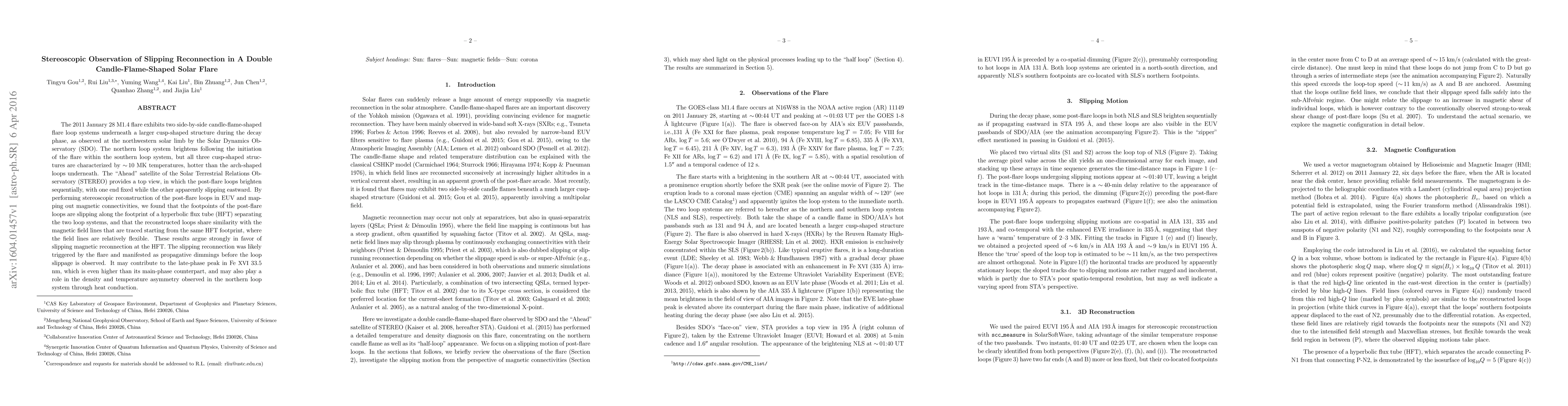 The 2011 January 28 M1.4 solar flare shows two candle-flame-shaped loop systems undergoing slipping reconnection along a hyperbolic flux tube, as observed by SDO and STEREO. This reconnection likely triggered a late-phase peak in Fe XVI emission and contributed to the observed asymmetry in the northern loop system.