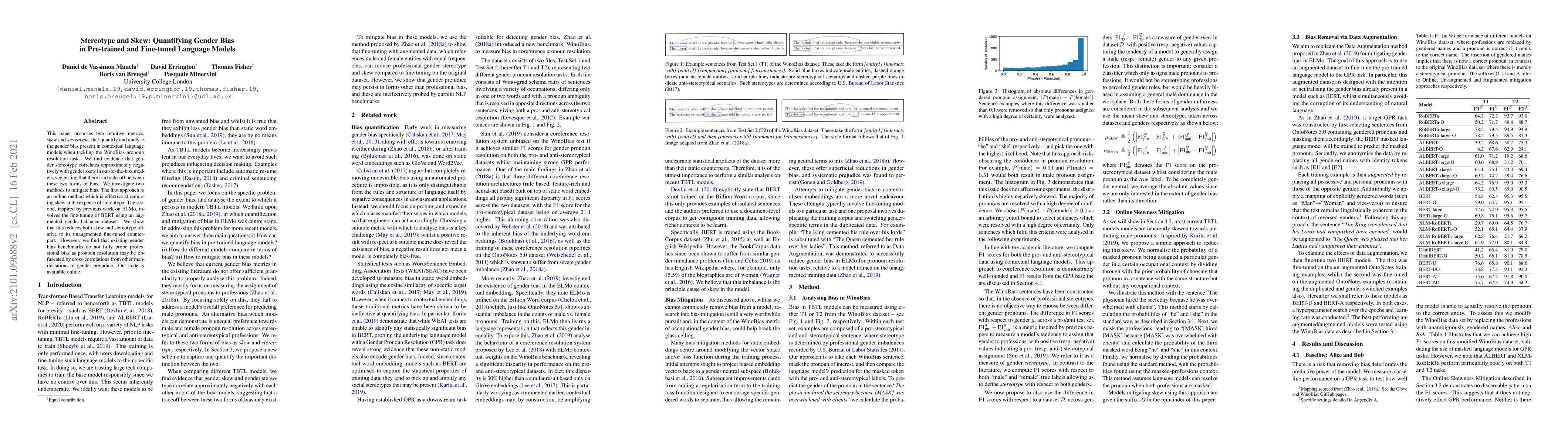 This paper introduces metrics to quantify gender bias in language models, revealing a trade-off between stereotype and skew biases. It proposes two mitigation methods, one effective at reducing skew and another that fine-tunes BERT with a balanced dataset to lower both biases, though existing benchmarks may not fully capture professional bias.