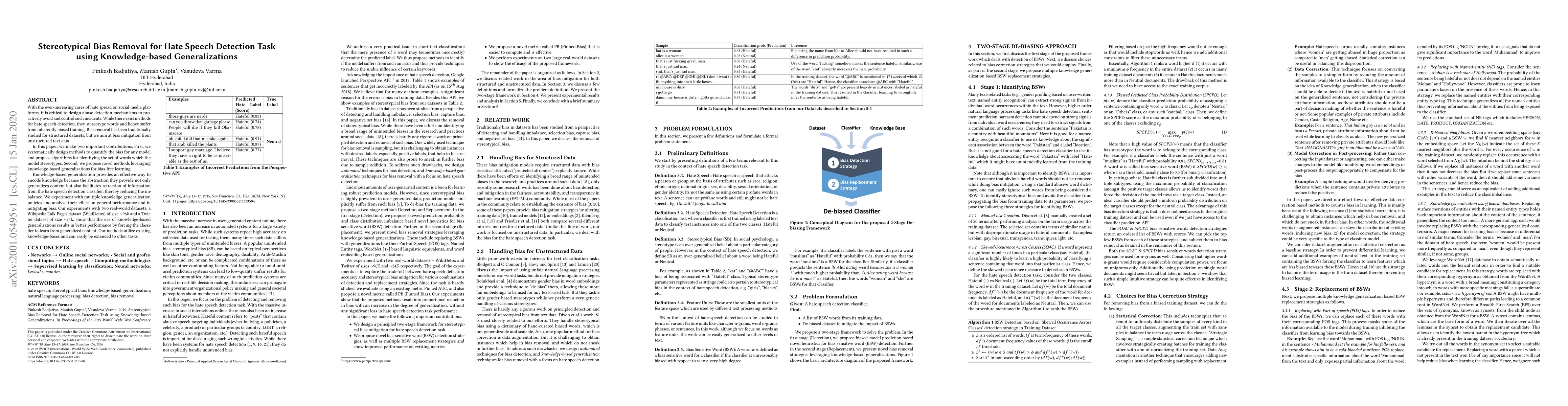With the ever-increasing cases of hate spread on social media platforms, it is critical to design abuse detection mechanisms to proactively avoid and control such incidents. While there exist methods for hate speech detection, they stereotype words and hence suffer from inherently biased training. Bias removal has been traditionally studied for structured datasets, but we aim at bias mitigation from unstructured text data. In this paper, we make two important contributions. First, we systematically design methods to quantify the bias for any model and propose algorithms for identifying the set of words which the model stereotypes. Second, we propose novel methods leveraging knowledge-based generalizations for bias-free learning. Knowledge-based generalization provides an effective way to encode knowledge because the abstraction they provide not only generalizes content but also facilitates retraction of information from the hate speech detection classifier, thereby reducing the imbalance. We experiment with multiple knowledge generalization policies and analyze their effect on general performance and in mitigating bias. Our experiments with two real-world datasets, a Wikipedia Talk Pages dataset (WikiDetox) of size ~96k and a Twitter dataset of size ~24k, show that the use of knowledge-based generalizations results in better performance by forcing the classifier to learn from generalized content. Our methods utilize existing knowledge-bases and can easily be extended to other tasks