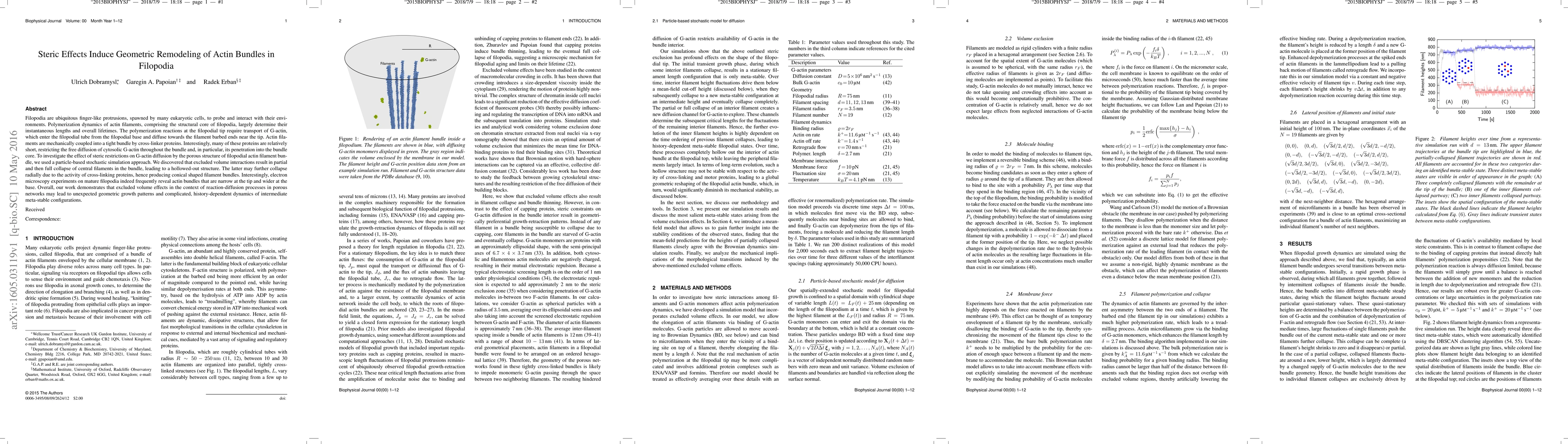 This paper investigates how steric restrictions from cross-linking proteins induce geometric remodeling of actin bundles in filopodia. Using stochastic simulations, the authors found that excluded volume interactions cause the collapse of central filaments, resulting in hollowed-out and conical-shaped bundles, which are consistent with observed electron microscopy images of mature filopodia.