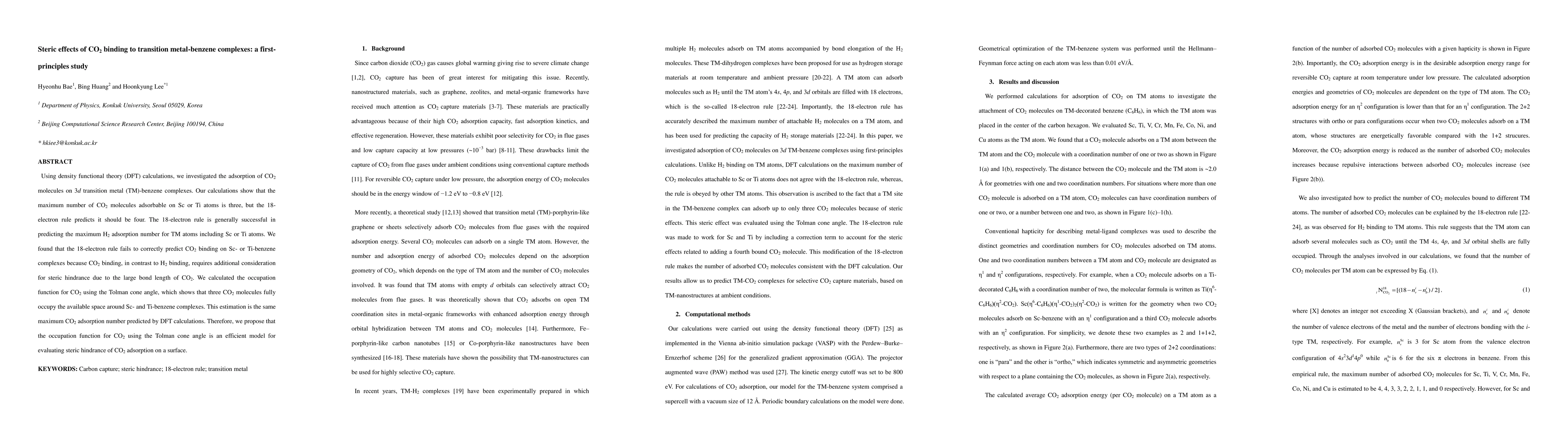 This study uses DFT calculations to explore CO2 adsorption on 3d transition metal-benzene complexes, revealing that steric hindrance limits CO2 binding to three molecules on Sc or Ti atoms despite the 18-electron rule predicting four. The Tolman cone angle method is proposed as an effective model for assessing CO2 adsorption steric effects.