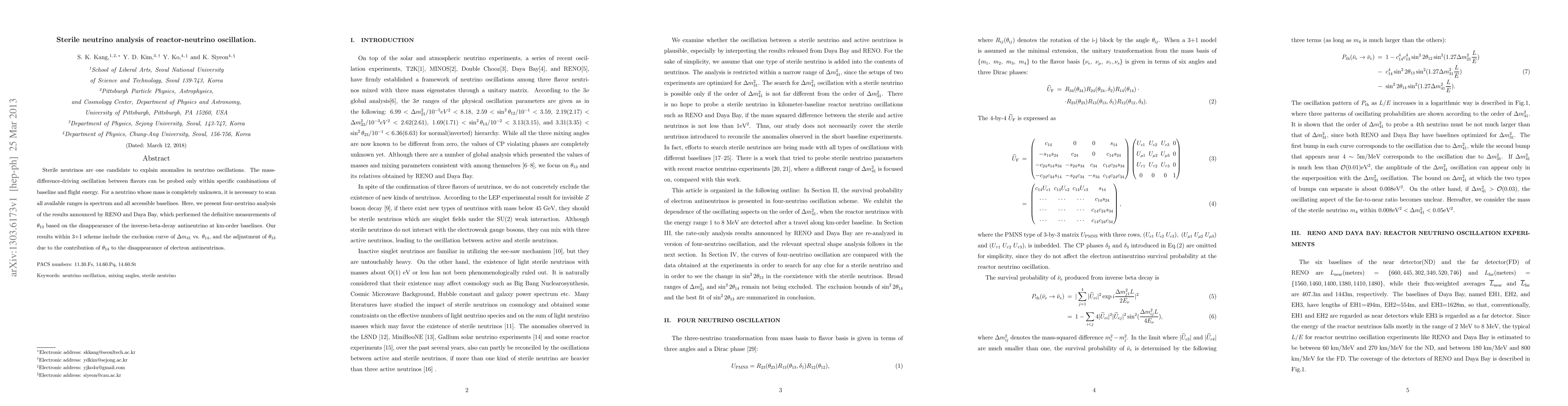 Sterile neutrinos are one candidate to explain anomalies in neutrino oscillations. The mass-difference-driving oscillation between flavors can be probed only within specific combinations of baseline and flight energy. For a neutrino whose mass is completely unknown, it is necessary to scan all available ranges in spectrum and all accessible baselines. Here, we present four-neutrino analysis of the results announced by RENO and Daya Bay, which performed the definitive measurements of $\theta_{13}$ based on the disappearance of the inverse-beta-decay antineutrino at km-order baselines. Our results within 3+1 scheme include the exclusion curve of $\Delta m_{41}$ vs. $\theta_{14}$, and the adjustment of $\theta_{13}$ due to the contribution of $\theta_{14}$ to the disappearance of electron antineutrinos.