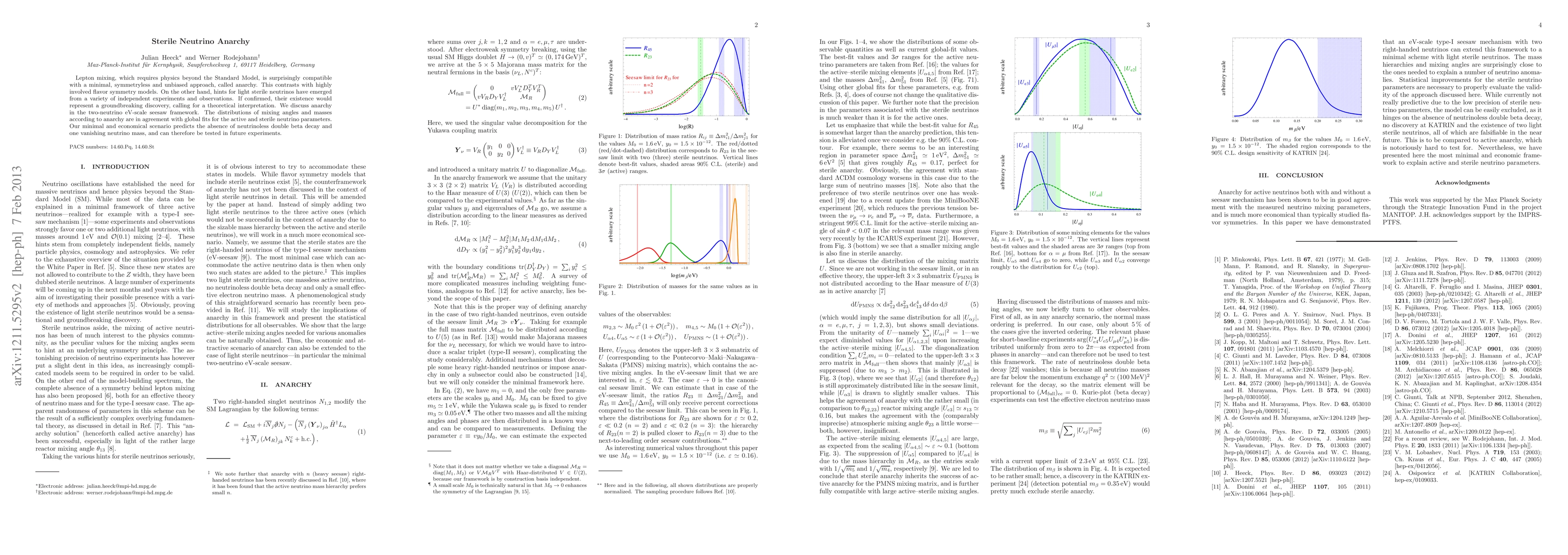 This paper explores the "anarchy" approach to lepton mixing, which aligns with minimal theoretical assumptions, contrasting with complex flavor symmetry models. It also discusses the implications of light sterile neutrinos, suggesting that anarchy in the eV-scale seesaw framework can accommodate both active and sterile neutrinos, predicting no neutrinoless double beta decay and one vanishing neutrino mass, thus offering testable predictions for future experiments.